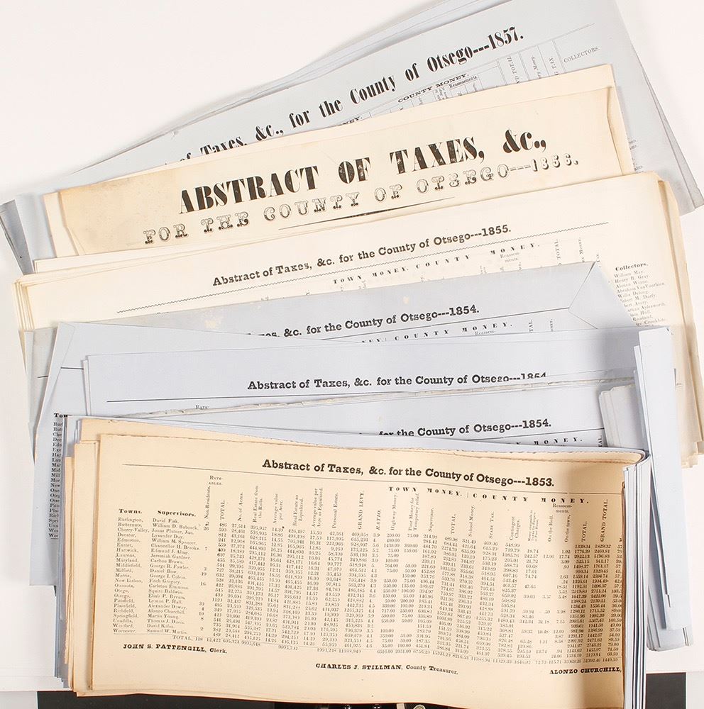 86 Abstract of Taxes, & c. for the County of Otsego 1853 during the Gold Rush years. 7.5" x 17.75". Date: 1850's Location: Ostego, New York HWAC # 54264