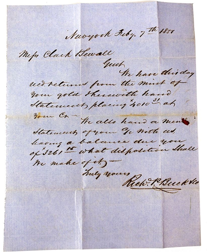 Hand written letter sheet from R.P Buck of New York to Clark Sewall of Bath, Maine. Buck was informing Sewall that the gold dust sent by Sewall had been processed and the amount due him was $3,261.15. Buck asked Sewall, “What disposition shall we make of it?” The piece has folds, slight staining, including some sealing wax marks. The lettering is very crisp. Good. State: Maine City: Bath Date: February 7, 1851 FHWAC#: 55087