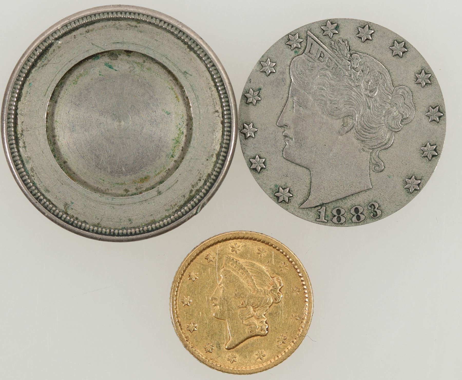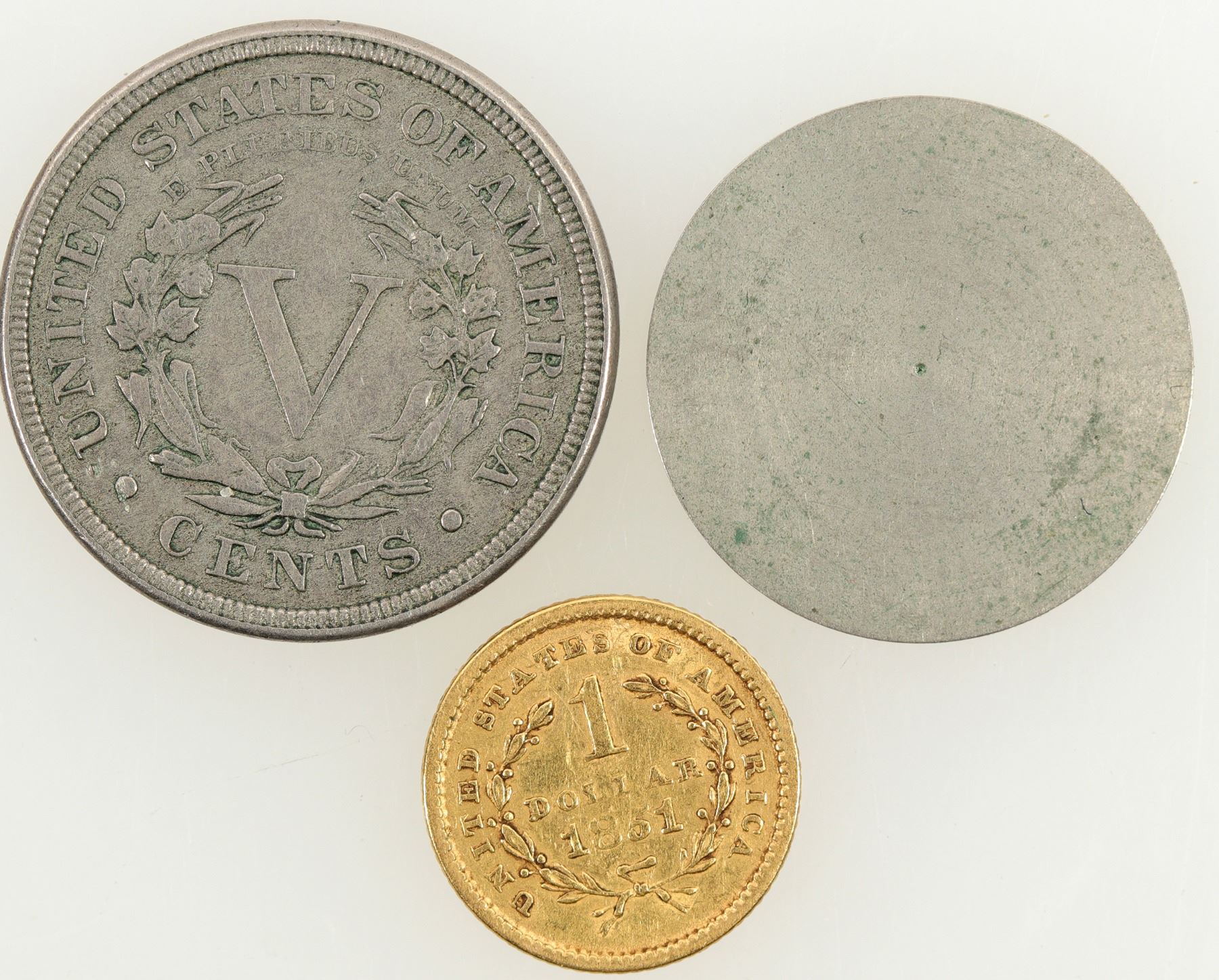 Unique! 1851 one dollar U. S. gold piece, inset in an 1883"V" nickel. The nickel's obverse has been shaved off and is removable. Gold piece is F-VF condition.