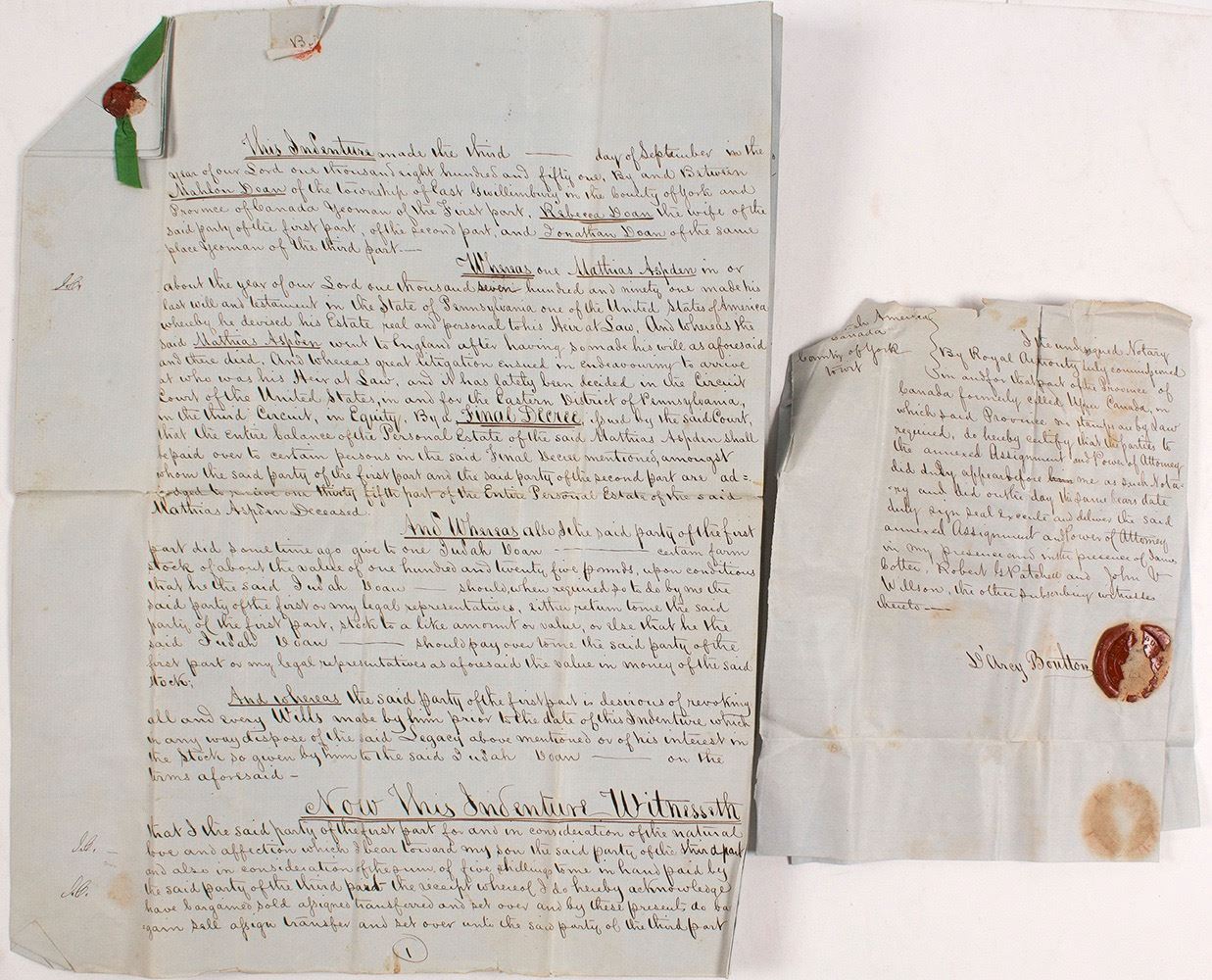 Large legal document, Doan and family and Matthias Aspden of Philadelphia, September 1851. Aspden was from a very wealthy Philadelphia family from a self-made fortune. When he died, the will was contested by various relatives and became subject of a suit in the US Supreme Court. Provenance: Newbold estate papers, with an unknown tie to John Newbold. Date: Location: Pennsylvania HWAC# 56342