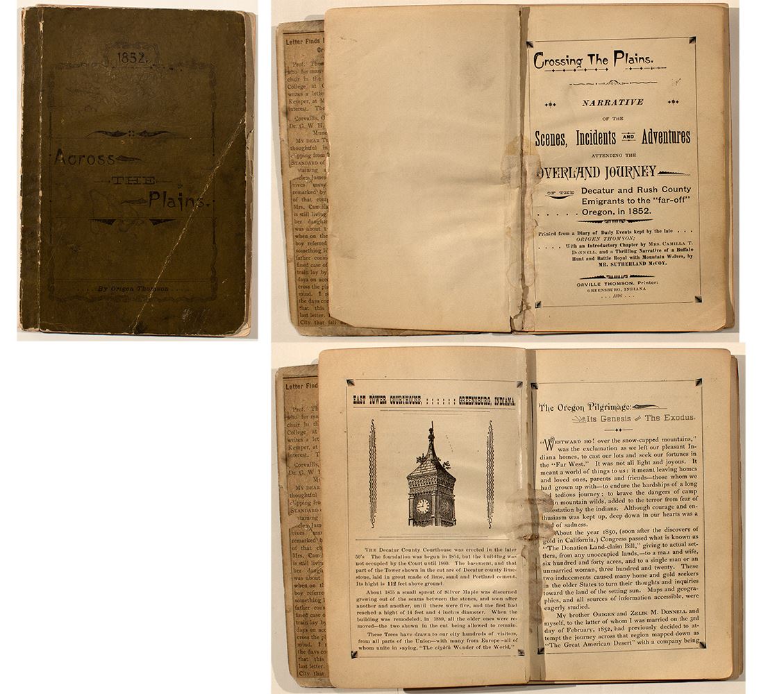 Crossing the Plains, Narrative of the Scenes, Incidents and Adventures attending the Overland Journey of the Decatur and Rush County Emigrants to the "Far-off" Oregon in 1852. Printed from a Diary and Daily Events kept by the late Origen Thomson. Includes a narrative of a buffalo hunt, a battle among wolves, description of crossing mountain passes and fording rivers, camping at night and ice cream on the Fourth of July! Also has a list of all of the members of the Crawford Party. No editions of this book (1896) are currently listed on Amazon or ABE Books. Cover has large bend across bottom right. "J. M. Thomson" written on front page. A relative??? This is an extremely rare book.