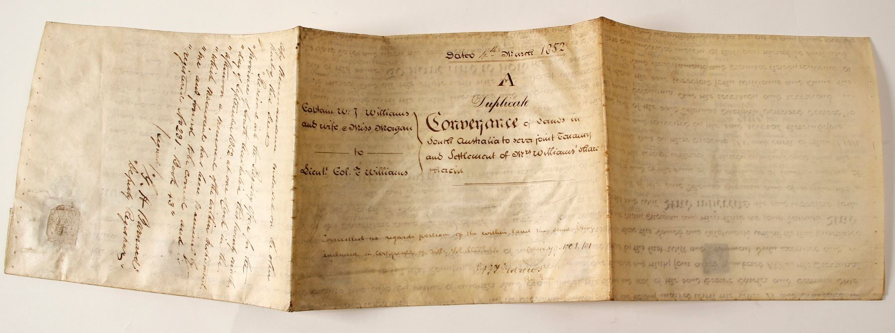 Very large (23 x 28") indenture dated March 4th, 1852 between Woodford John Williams, a Captain in her Majesty's Navy, Southampton County, and his wife Mary Morgan to Col. Williams. "Convergence of lands in South Australia to serve joint (illegible) and Settlement of Mrs. Williams." Printed on vellum (?). Some soiling, but overall very nice condition for being from the 1850s! A quick internet search shows that Captain Williams also transported munitions to the Baltic Sea in 1855. (Prag Collection) Date: Location: zAustralia HWAC# 55425