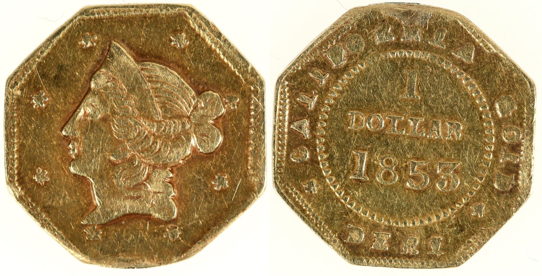 M. Deriberpie marked his pieces: California Gold / 1 / Dollar / 1853 / DERI. Octagonal, 12 mm; 1.2 grams. F-EF, rim ding reverse. Rarity 5.