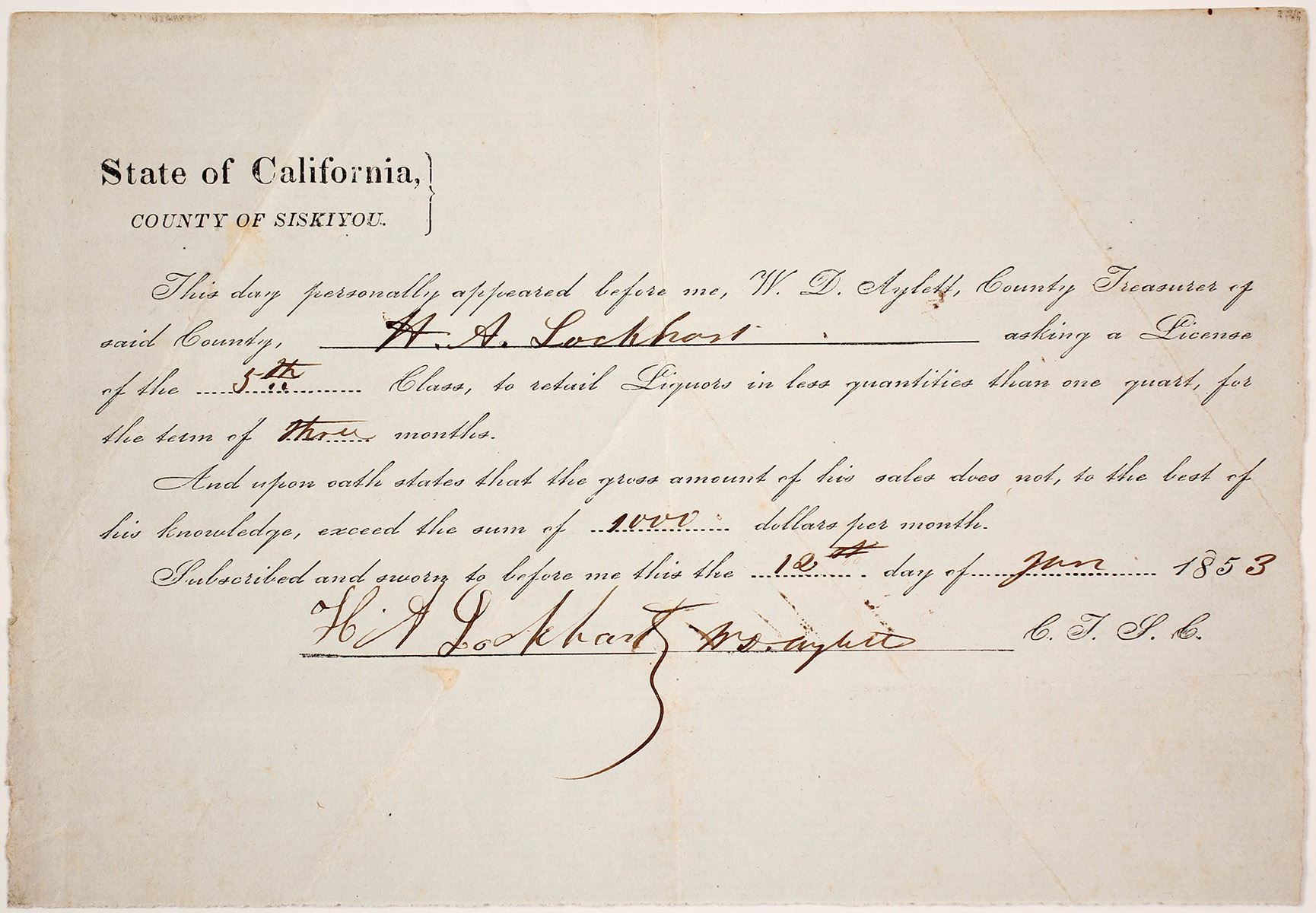 Rare!! H.A. Lockhart has purchased a liquor license good for 3 months. Dated Jan. 10th, 1853. 5.5 x 8" Folds and creases. Soiling on reverse. Printed on light blue paper. The History of Siskiyou County (1881) mentions twin brothers Harry and Sam Lockhart and their business dealings in Soda Springs (starting in 1852) and Humbug City (Harry kept a hotel). In January 1857, the Pit River Indians murdered Harry and four others at the ferry on Fall River [see pg. 165]. Samuel avenged his brother's death by murdering many Indians before leaving to the Salmon River rush in Idaho where he was killed over a mining claim. Nowhere in this reference does it give Harry Lockhart's middle initial for us to confirm this license was for him, but it certainly seems highly likely as Harry is mentioned multiple times and no other H. Lockhart is referenced. Date: Location: Siskiyou County, California HWAC# 60441