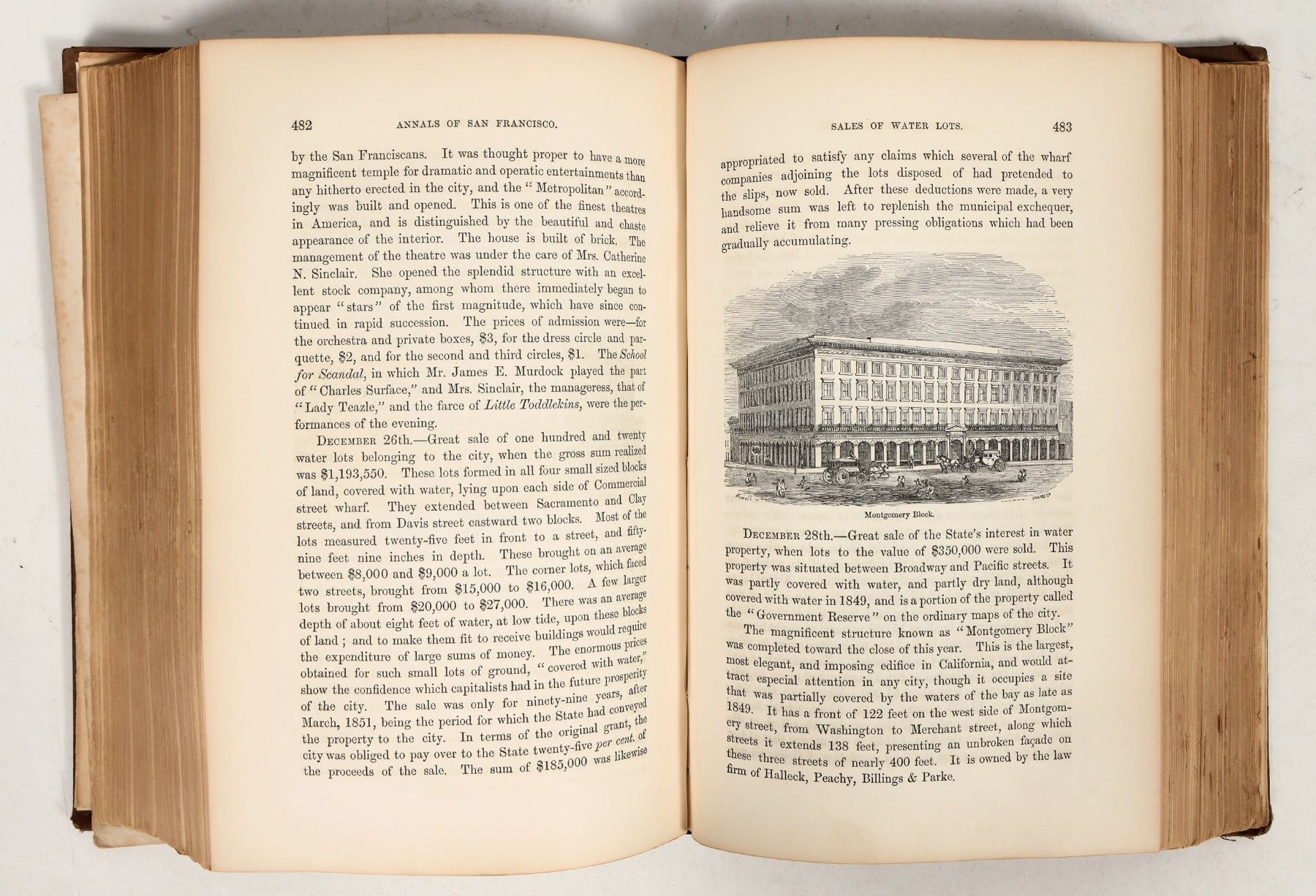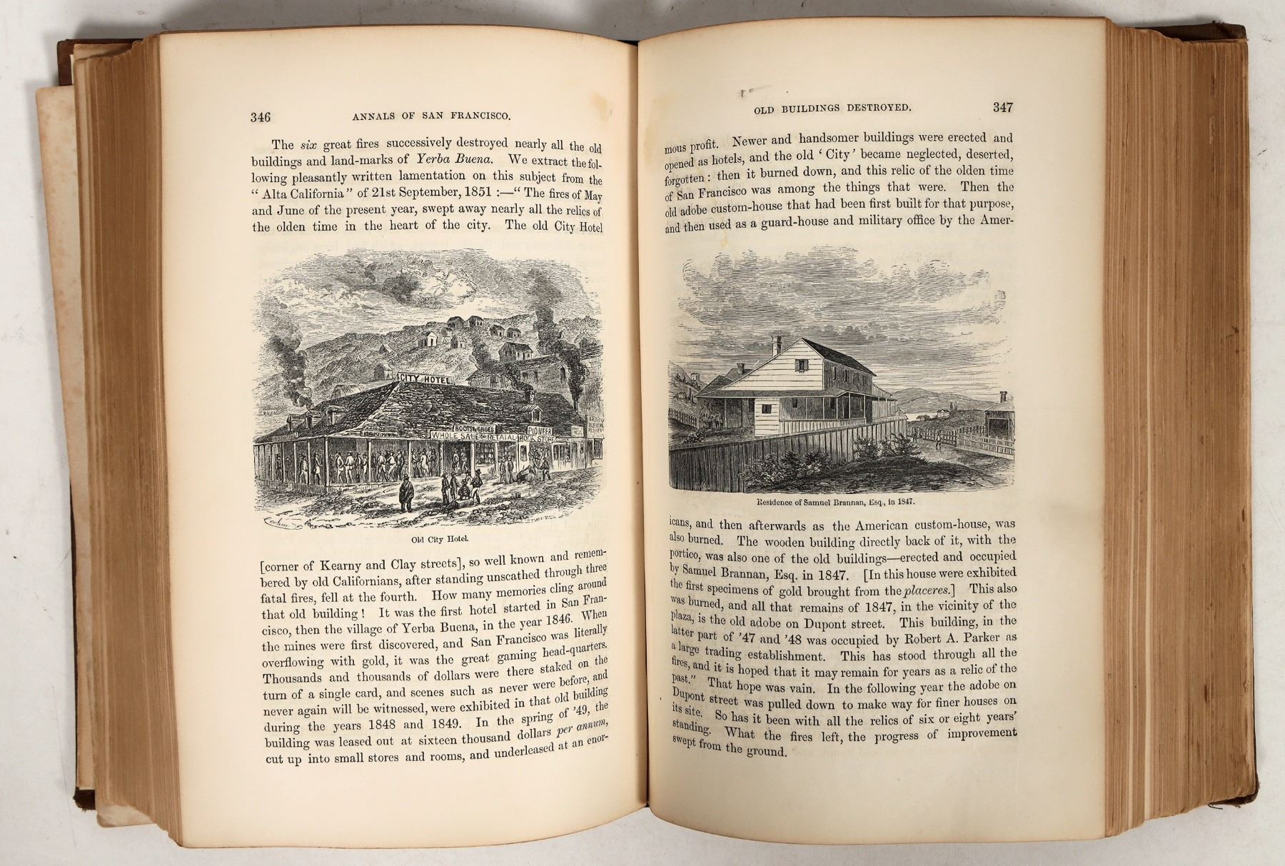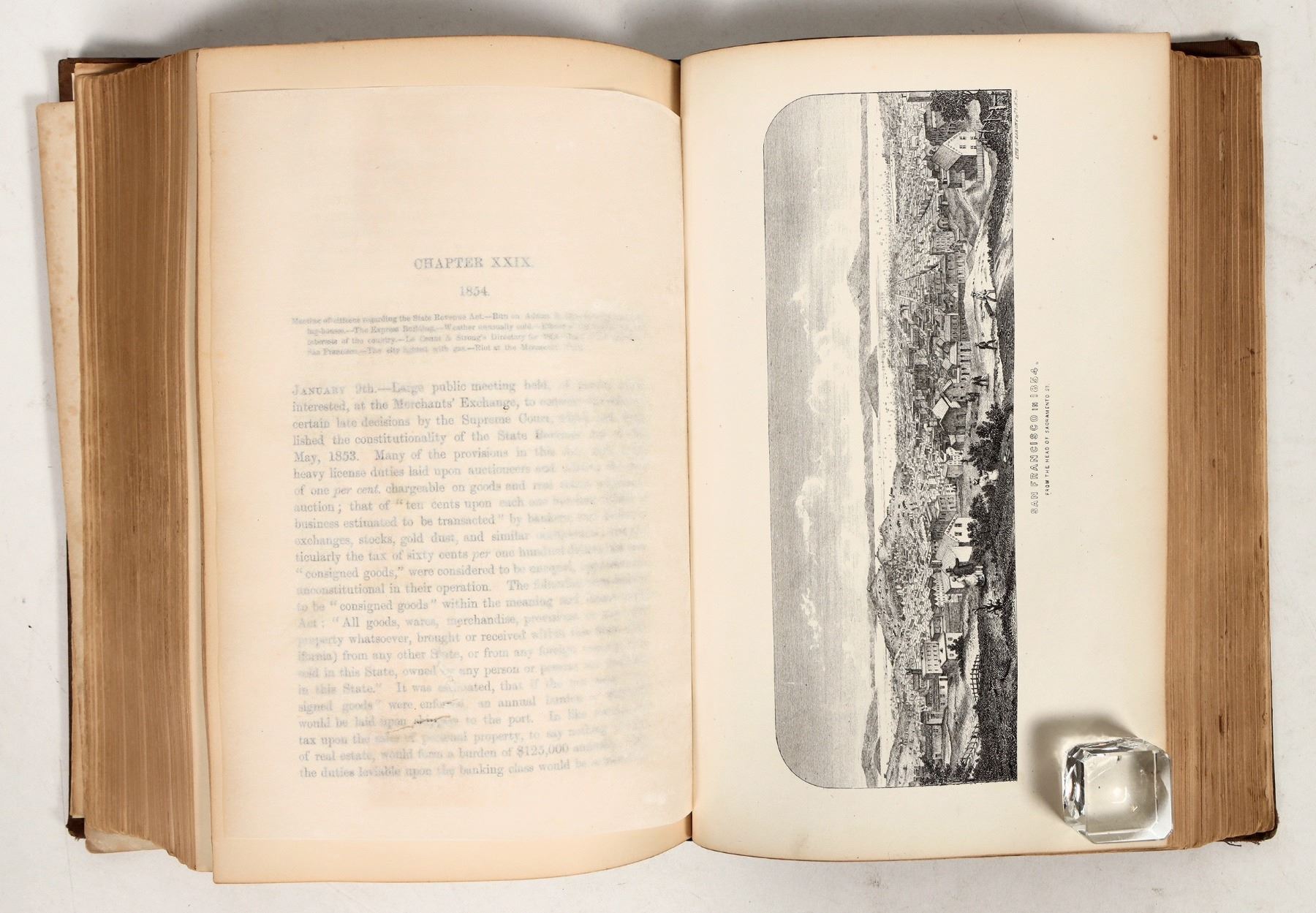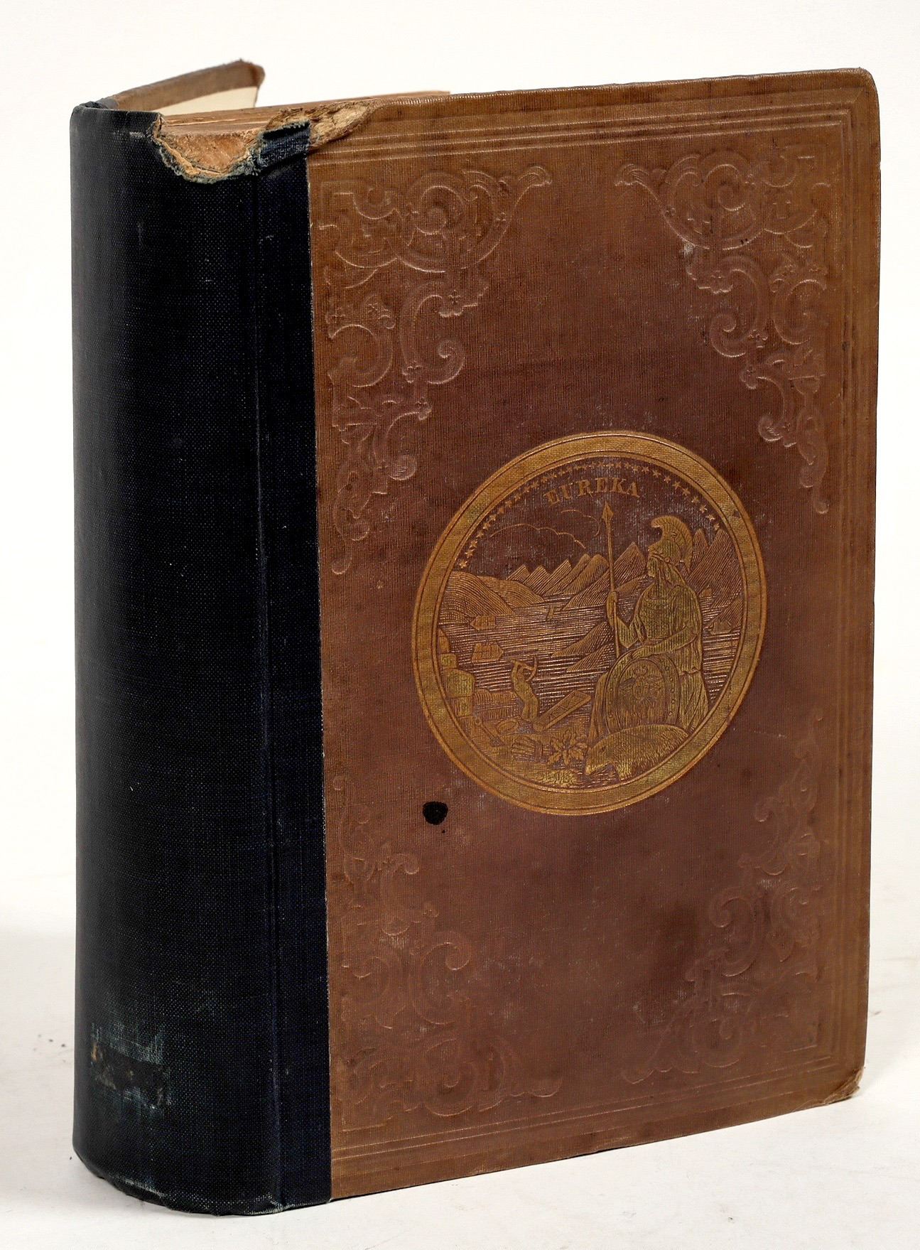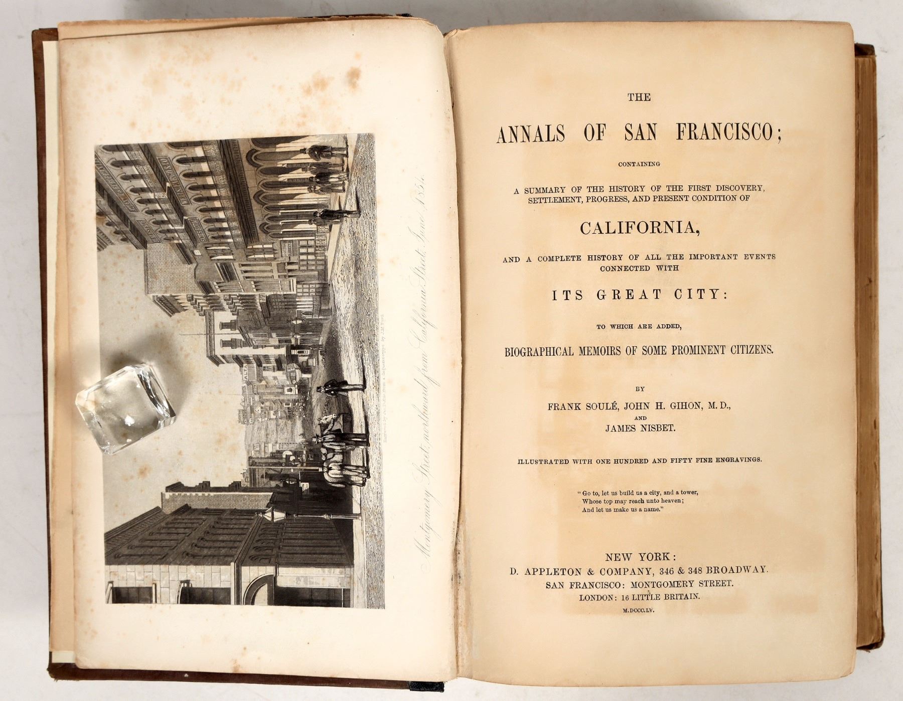 History of California and San Francisco by Soule, Gihon, & Nisbet, published in 1855 by D. Appleton & Co., New York. 813 pp. 150 illustrations. Missing maps. Focuses on all of the events that lead to the boom of San Francisco, most importantly the Gold Rush just a few years prior. Repaired spine, pictorial brown boards. 9.5 x 6" Foxing, stains, and some bleeding of illustrations into pages, but text is very readable. Fantastic Gold Rush history!