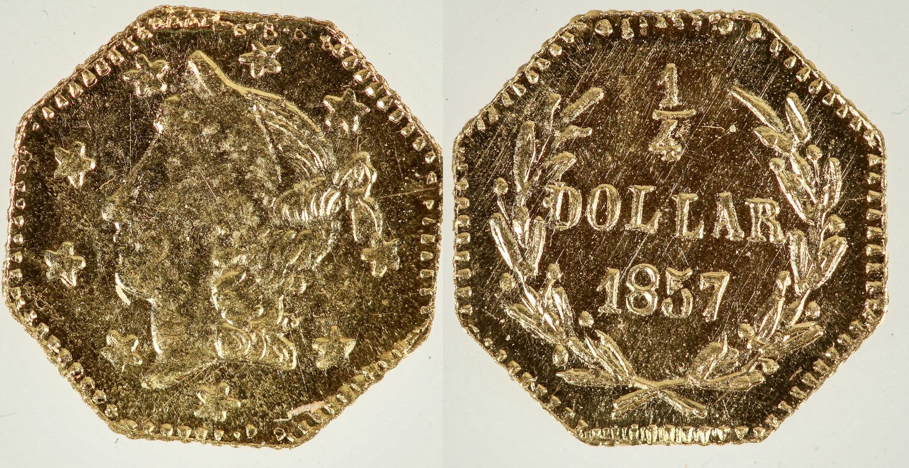 A restrike of BG-1301. Period Three fractional gold pieces made by Herman Kroll are technically restrikes, having been made late in the 19th century and early twentieth. BG-1301 is an 1857 dated $.25; octagonal, 9 mm; 0.3 grams, BU condition. Mike Locke comments: "Kroll's original denominated issues are not restrikes, they are new issues that were of questionable legality to produce. However, circa 1960 someone got a hold of Kroll's dies and made restrikes of Kroll's original issues." Our thanks to Mike Locke at www.calgoldcoin.com.