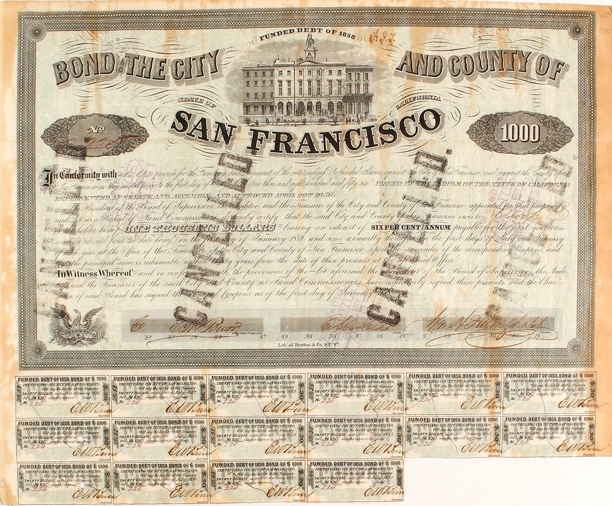 Cancelled Bond of the City & County of San Francisco, with 16 attached coupons, Bond #225 for $1000. Signed by E.Y. Burr(?) President of Supervisors. 9.5" x 17". Date: 1858 Location: San Francisco, California HWAC # 54256