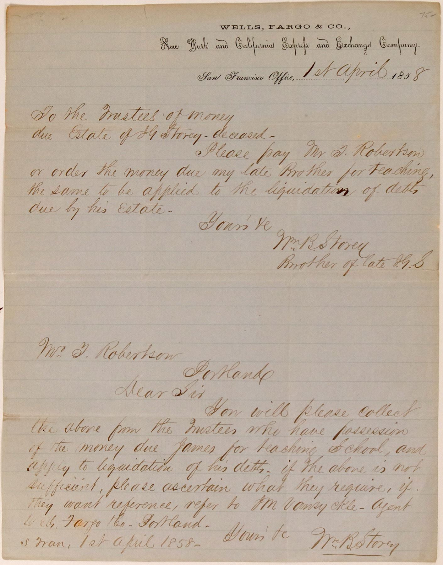 This letter is asking that the estate of J. G. Storey pay James robertson for teaching school. Signed by William B Storey. Storey was born in England and arrived in San Francisco in 1852. He was one of the pioneer express messengers for Wells Fargo. He was also a member of the San Francisco Vigilance Committee. [History of Butte COunty by Mansfield] Must be an interesting story here!