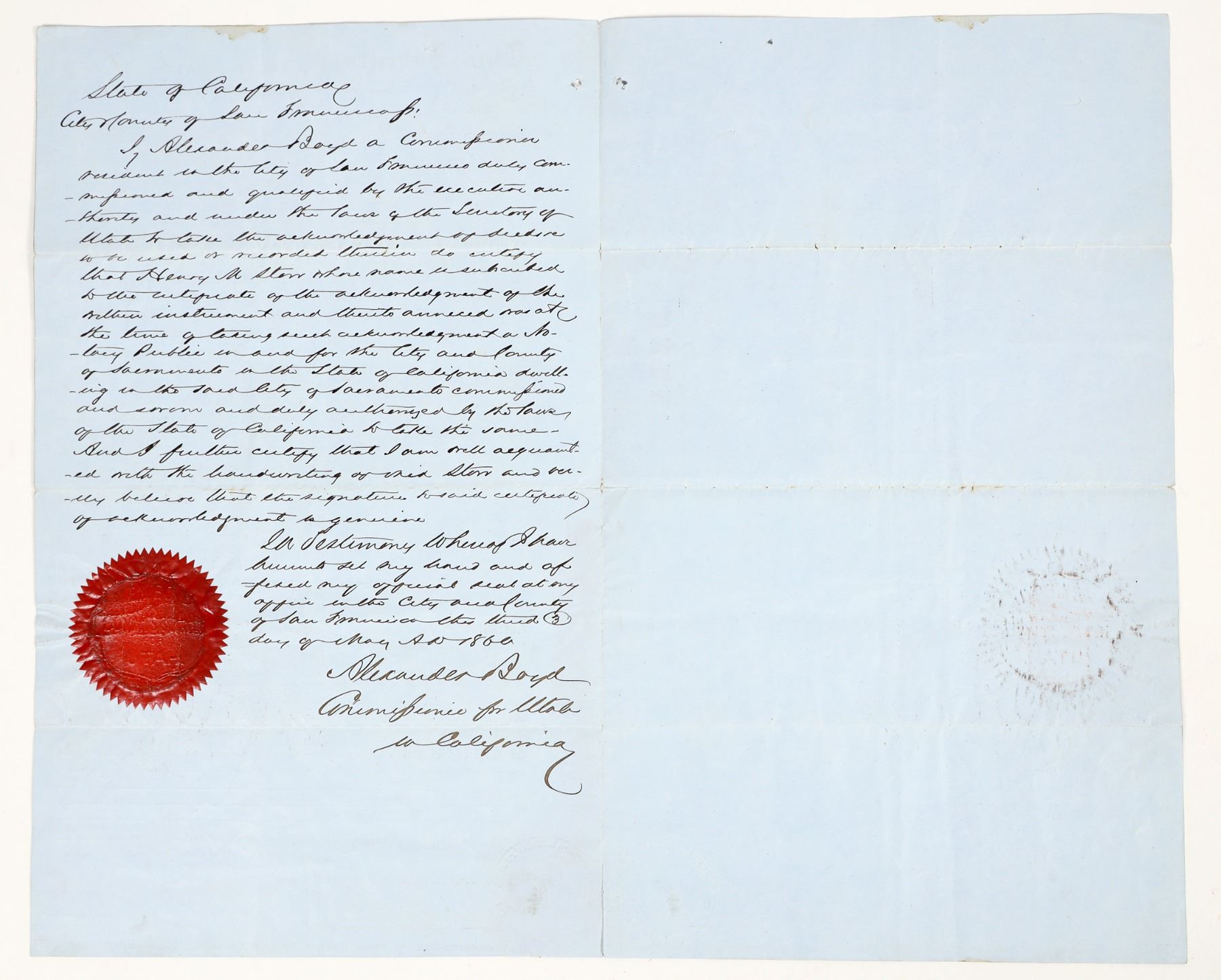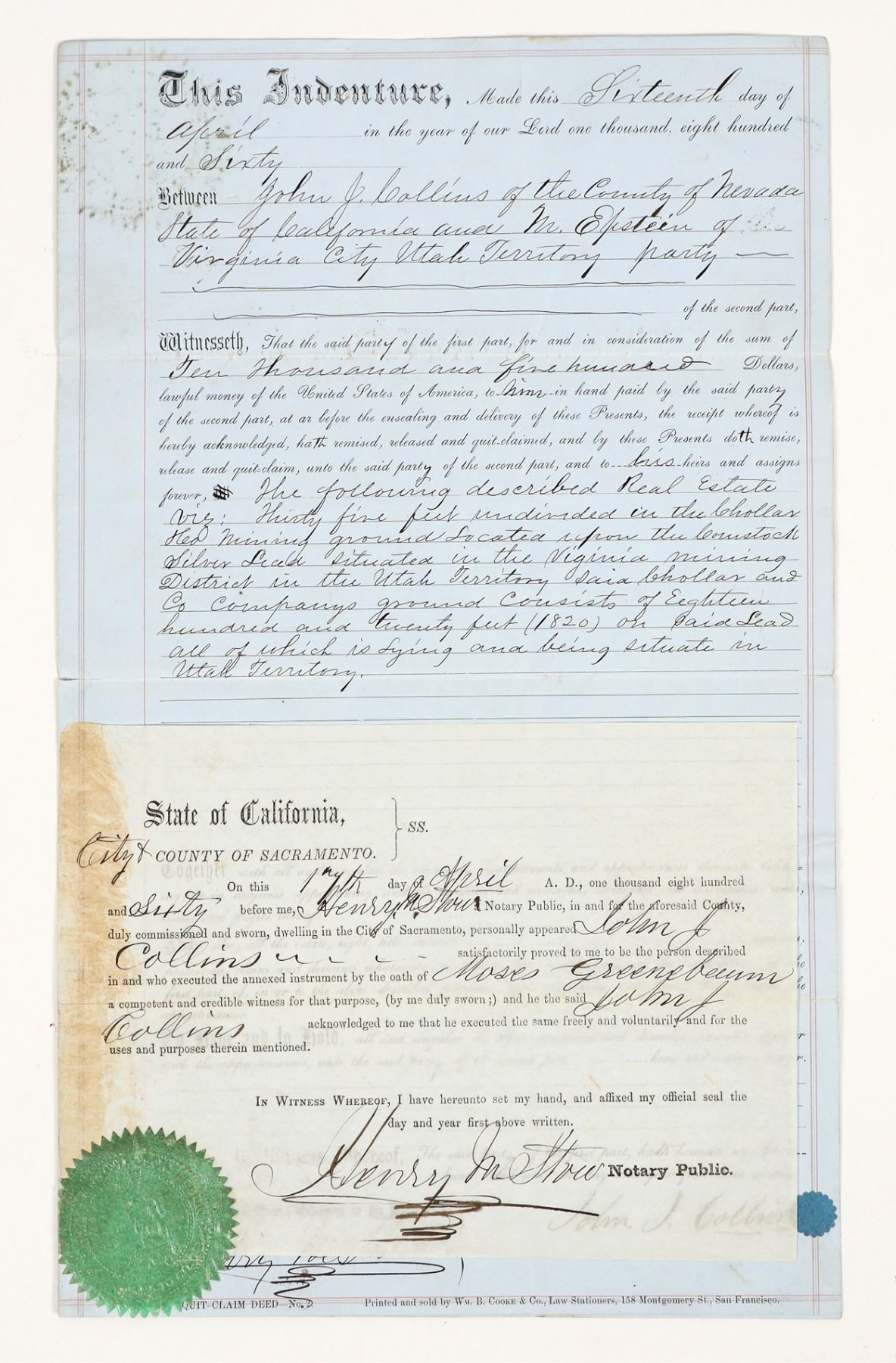 Extremely rare and early! Dated April 16th, 1860 when Nevada was still part of Utah Territory. Agreement between John J. Collins of Nevada County, California and M. Epstein of Virginia City, Utah Territory. For 35 feet, undivided in the "Chollar & Co. Mining ground located upon the Comstock Silver Load(sic.) situated in the Virginia Mining District in the Utah Territory." "Chollar and Co company's ground consist of eighteen hundred and twenty feet (1820) on said lead all of which is lying and being situate in Utah Territory." Signed by Collins. Signed by the notary public in Sacramento and Alexander Boyd. 13.5 x 8.5" By 1860, Billy Chollar had apparently already sold out. The Chollar Mine was between the Hale & Norcross and Potosi. Henry Comstock said he had located the claim and gave it Billy Chollar. Chollar sold out and moved back to Grass Valley.