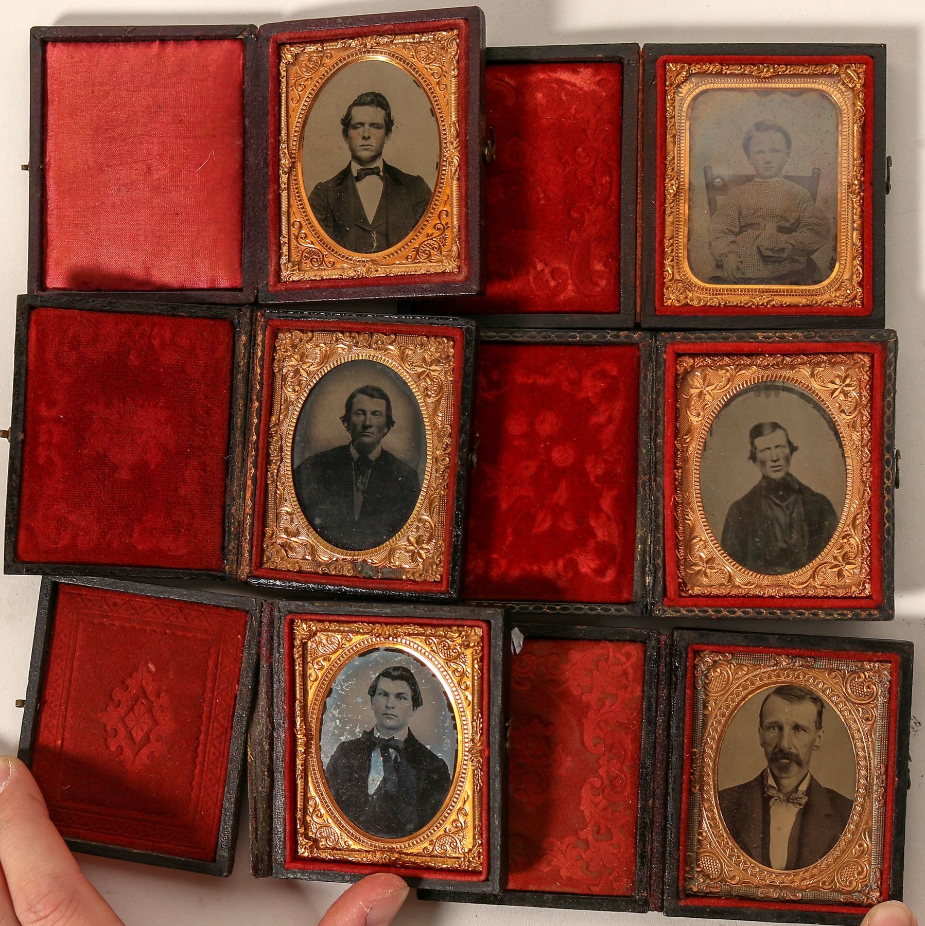 Six cased early portraits, all 2.5 x 3", cloth lined. All of the cases appear to be pre Civil War, as none are patriotic. Five are men portraits and one a child. Most are ferro-types in excellent condition, and one may be an ambrotype in excellent condition. The question here is "are all of these pre-civil war," such that they are circa 1860-62, or are they post-civil war about 1870? Please see the photos!