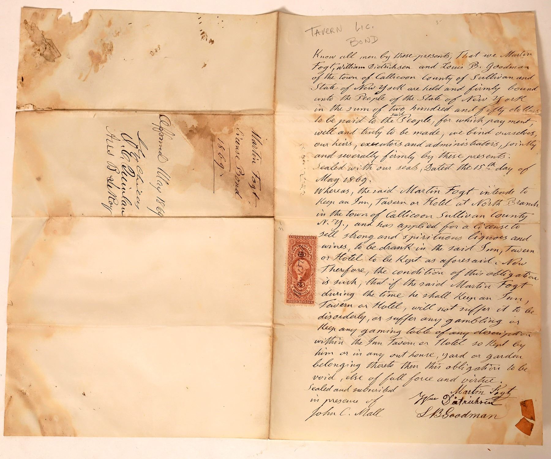 Tavern license bond issued to Martin Fogt, William Dietrichsen and Louis B. Goodman on the town of Callicoon, Sullivan County, New York, on May 15th, 1869. "Martin Fogt intends to keep and Inn, Tavern or Hotel at North Branch in the town of Callicoon...and has applied for a license to sell strong and spiritous liquors and wines..." but he "will not suffer it to be disorderly, or suffer any gambling or keep any gaming table of any description within the Inn, Tavern, or Hotel..." Signed by all 3. 25 cent revenue stamp attached bottom left. 12 x 7.5" Folds, large stains, a few tears. The town was formed in 1842.