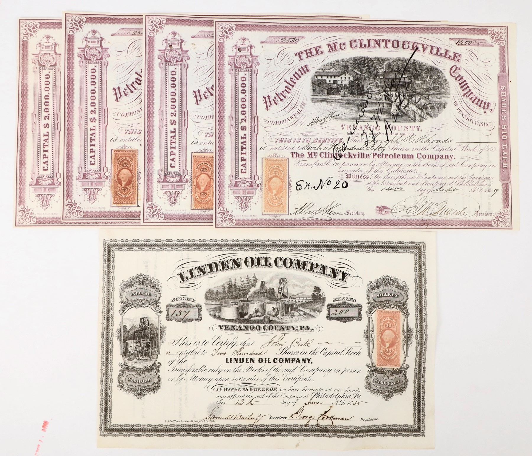Lot of 5 issued stocks. One is Linden Oil Company (1865); four stocks for McClintockville Petroleum Company (1869-72). Both self-identified as Venango County, PA. Nice vignettes.