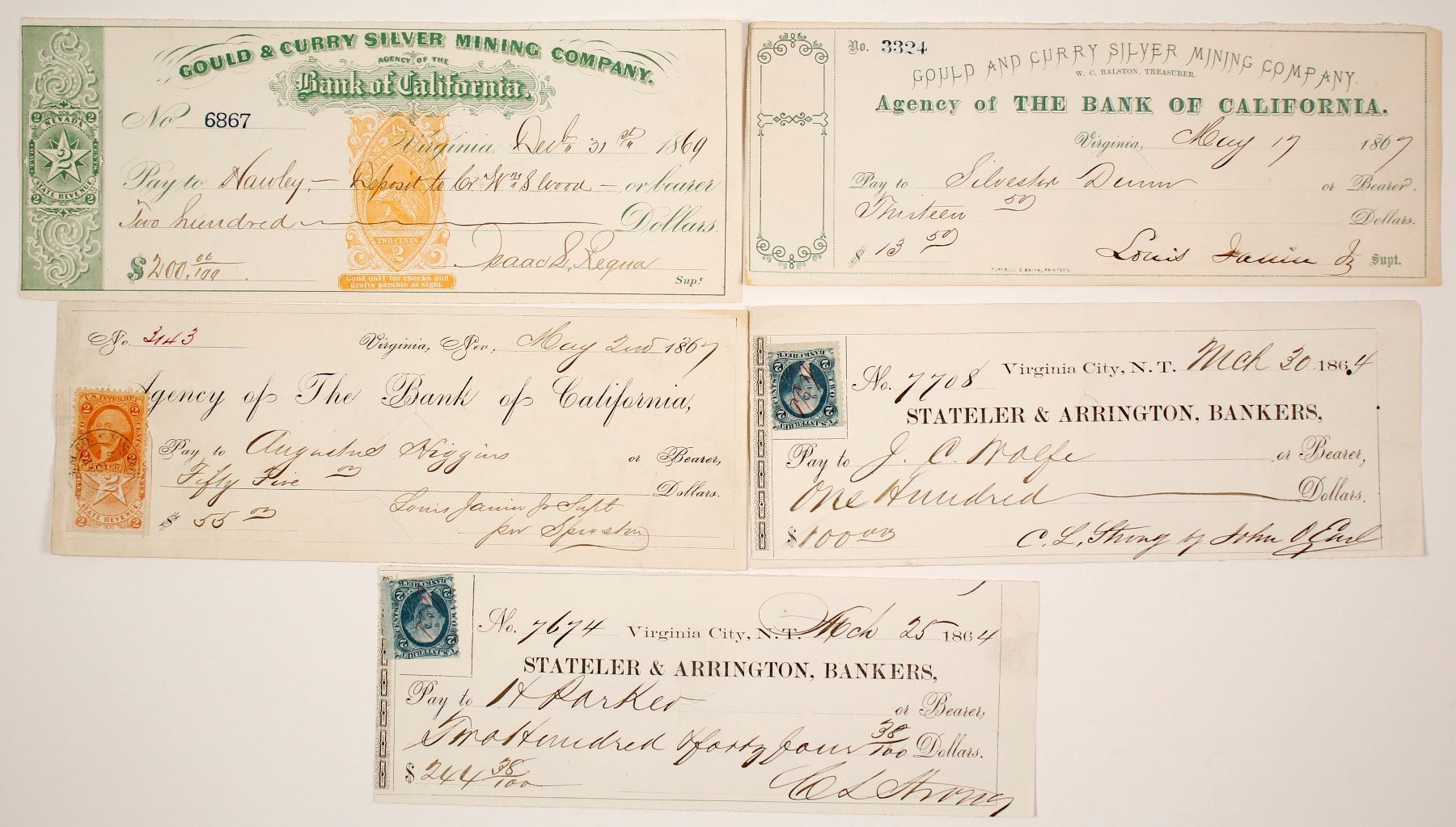 Lot of 6 different including three territorial. Includes: Wells Fargo & Co. 1864 Nevada Territory check signed by RN Graves for the Empire Mill & Mining Co.; Stateler & Arrington 1864 Nevada Territory check signed by Charles L. Strong for the Gould & Curry Mining Co. and one signed for Strong by president John O. Earl; two different 1867 Gould & Curry checks signed by Janin (one with Nevada adhesive revenue stamp); and an 1869 Gould & Curry Silver Mining Co. Bank of California check with RN-B and printed green Nevada revenue stamp, signed by Isaac Requa. Date: 1864-1869 City: Virginia City State: Nevada HWAC# 77347