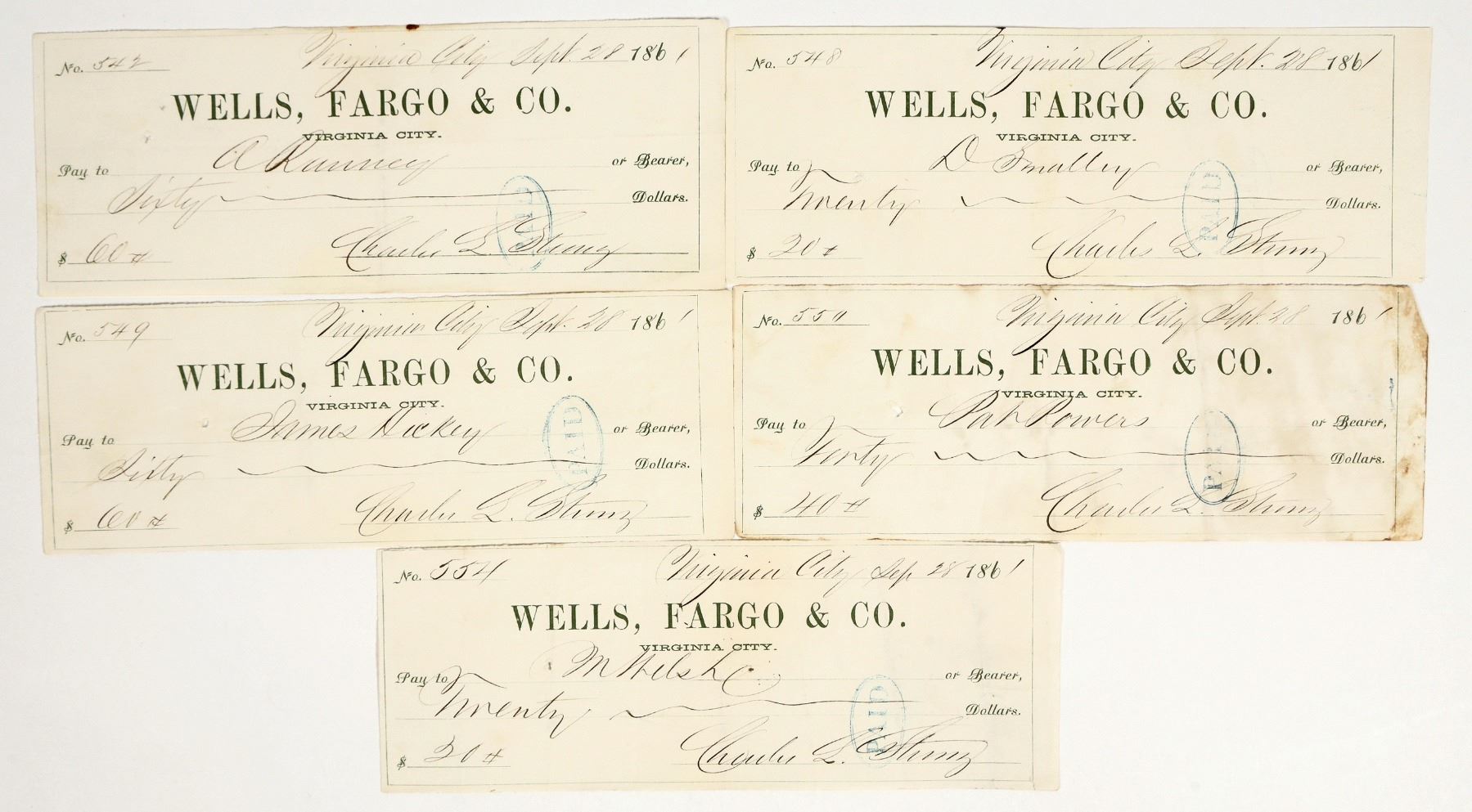 Lot of 5. These are the second generation Wells Fargo 1861 checks with green print. Earliest are the blue version. This group of five was issued by Charles Strong as superintendent. Strong would continue until 1864 when he was replaced by Charles Bonner for his management of the company's mill. He later took his own life. Rare to find a group of these early checks!