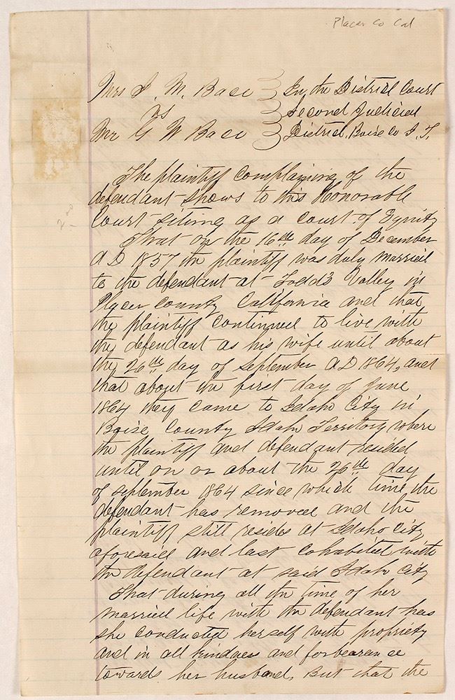 Dated Dec. 15, 1864 in the District Court of Boise, Idaho Territory. Complaint is between Mr. and Mrs. L.M. Ball, who were married in Todd Valley, Placer County in 1857 and lived there until moving to Boise in 1864. Mrs. Ball is suing her husband for perpetrating "harsh and tyrannical conduct towards her" once they arrived in Boise. His behavior is described as "inhuman" and made her "fear for her life." Yikes! Todd Valley is located 13 miles east of Auburn. Date: Location: Placer County, California HWAC# 58525