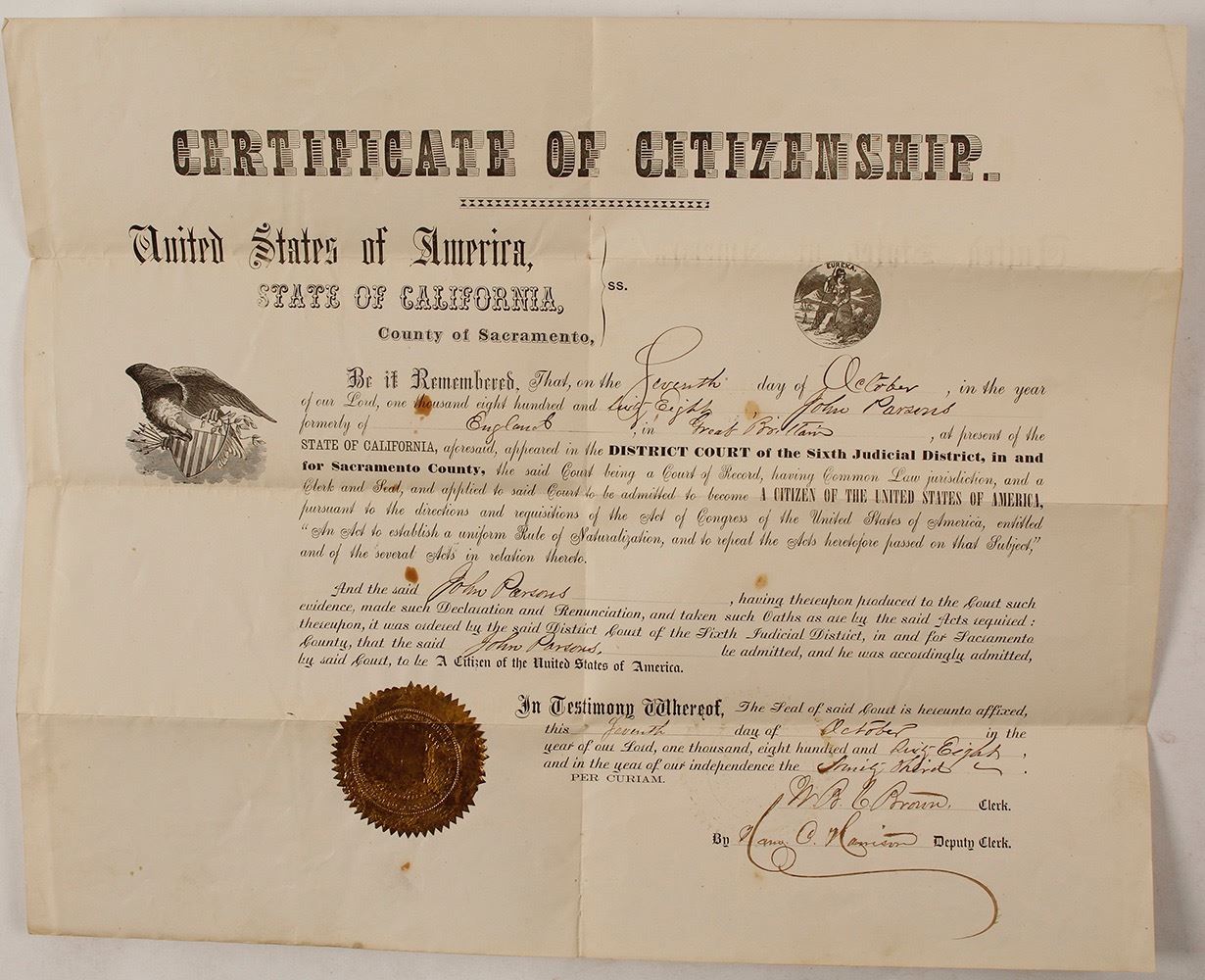 John Parsons was a farmer in Sacramento County in the 1870 census. He was born about 1826 in England. He passed away on 26 September 1911 and is buried in the Sylvan Cemetery in Citrus Heights. Signed by clerk WBC Brown and deputy clerk Harrison. 14 x 17". Gold Seal. American Eagle holding shield and a California state seal vignettes. Folds, small rip at fold edge, some foxing. Heavy paper is in good condition overall. Date: Location: Sacramento, California HWAC# 57410