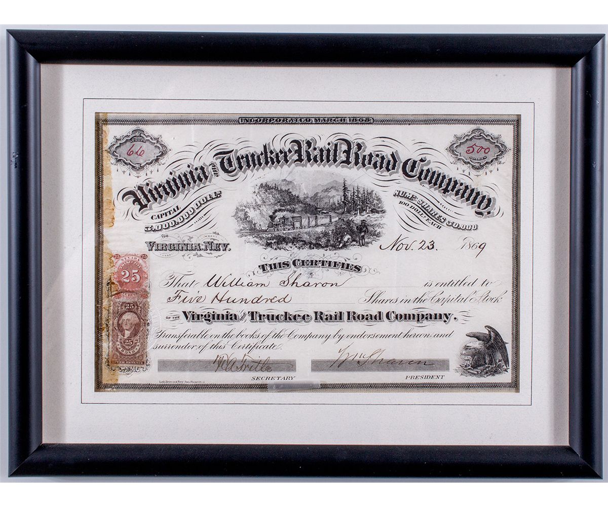 Incorporated in 1868 in Nevada. VERY EARLY No. 66 issued to William Sharon for 500 shares by F.A. Tritte, secretary, and Wm Sharon, president, on 23 November 1869. One red, Nevada State Revenue Stamp affixed to the certificate. One brown, 25 cent, R 44, R4 uncancelled, adhesive, imperf. The vignette is of two miners observing a Virginia and Truckee Railroad engine going by. The Virginia & Truckee Railroad was chartered 11 February 1869, opened 1 January 1870, and then sold to the Virginia & Truckee Railway on 1 July 1905. This certificate is very rare and desirable considering that it was issued to and signed by William Sharon. Brown staining on the left side, very clean elsewhere. (Toth V&T collection)City: Virginia CityCounty: Storey CountyState: NVDate: