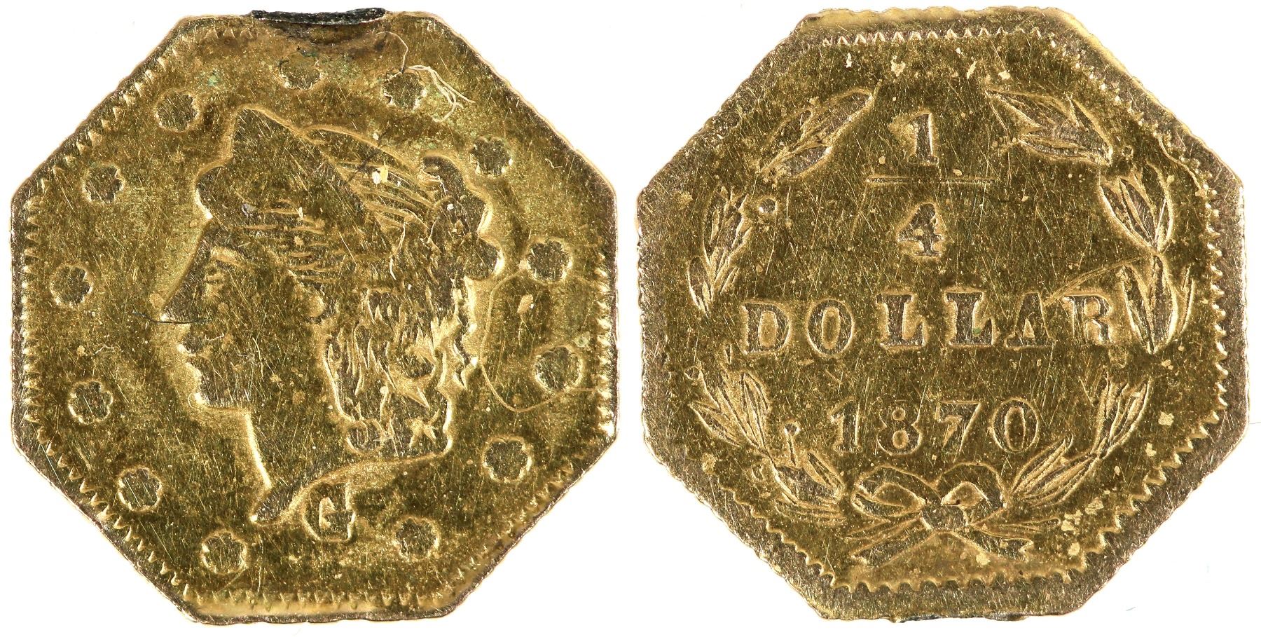 Made by Robert B. Gray & Co. Liberty head with 13 "crude six-pointed stars"; 1/4 / dollar / 1870. Octagonal, 10 mm, 0.3 grams. F-EF, top rim damage obverse. Rare!! Low rarity 7.