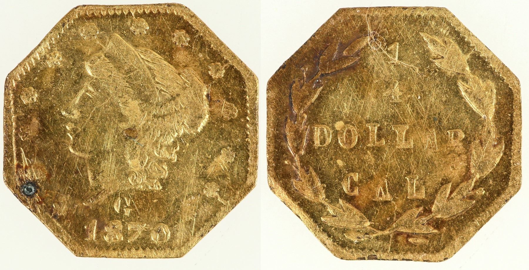 Robert B. Gray & Co. "incomplete G" variety. Rarity 4. 9.6 mm; 0.2 grams. F-EF condition, minor damage.