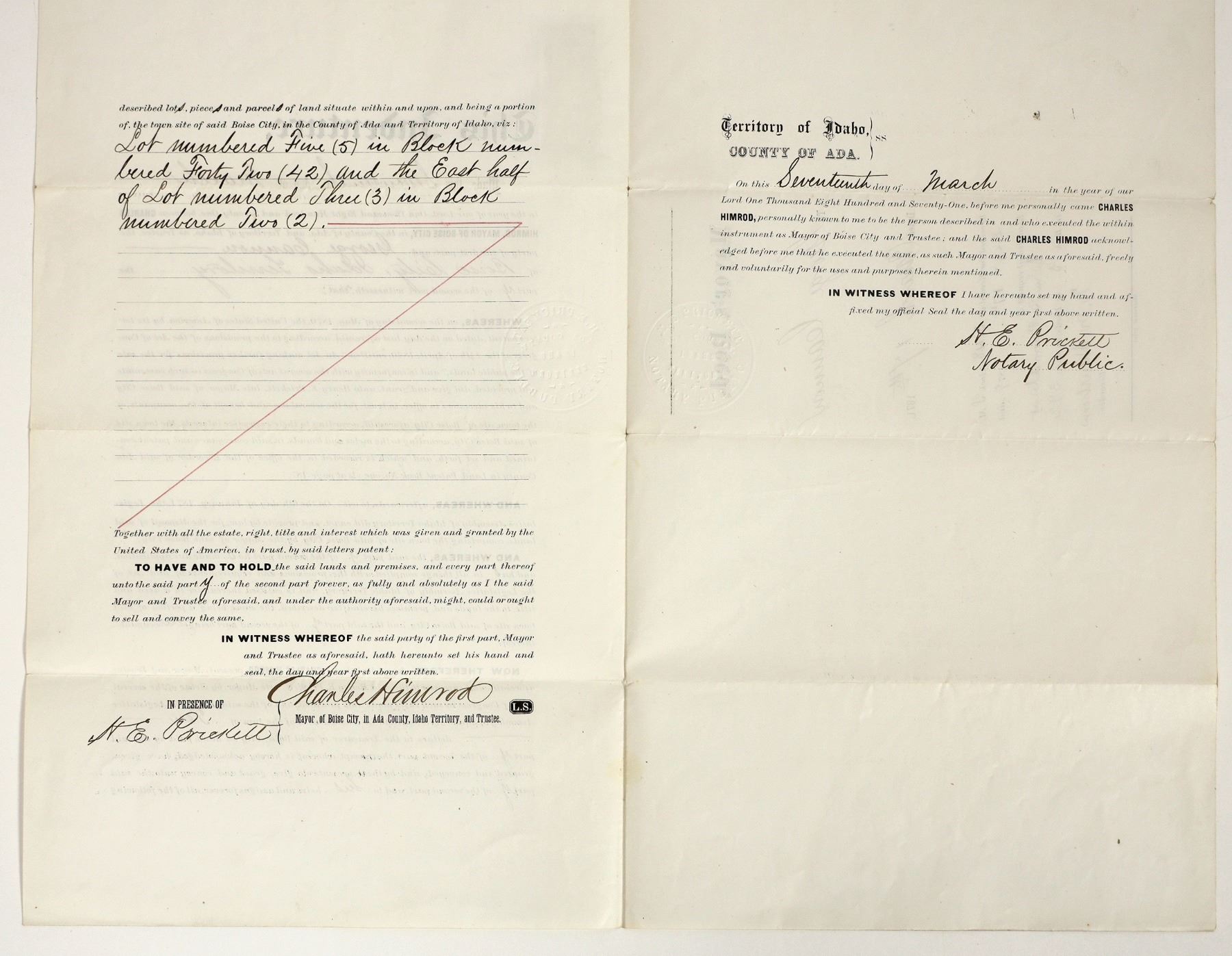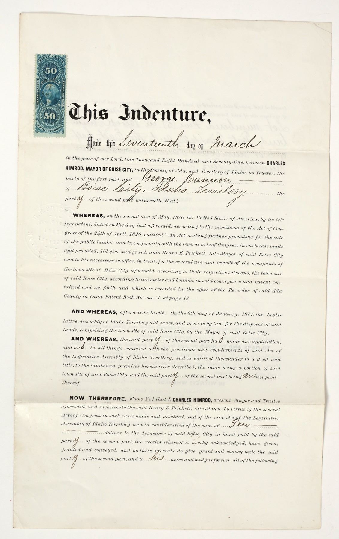 Mayor's Deed to Lots in Boise City, Idaho Territory, 1871. The US Congress in 1870 did give and grant unto the… mayor of Boise City, in trust, for the several use and benefit of the occupants of the town site of Boise City. A year later the Idaho Territorial Legislature did provide by law, for the disposal of said lands, comprising the town site of said Boise City, by the mayor of said Boise City. This is a somewhat generic "Mayor's Deed" where the mayor's office just needed to put in the buyer, the amount and the city lots purchased. In this case George Cannon bought lot number 5 in block number 42 and the east half of lot number 3 in block number 2 for the sum of $10. An amazing story of the early settlement of a major American city. 50 cent blue revenue stamp. Folds. 14 x 8.5"