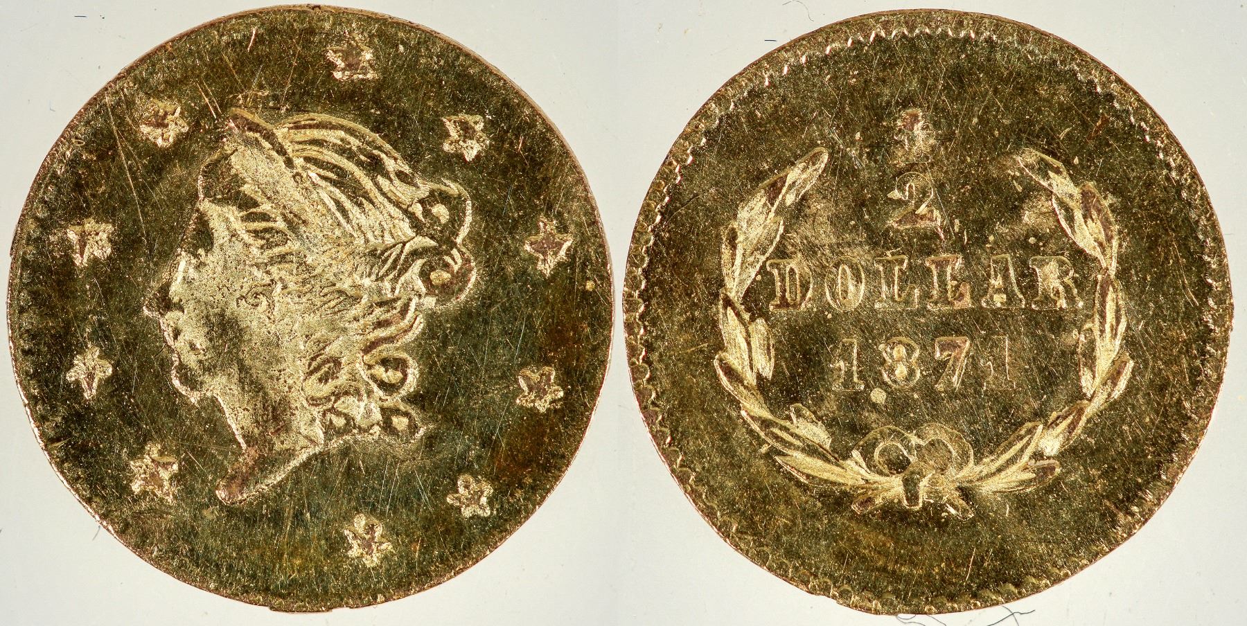 Frontier & Co. issue: 11 mm; 0.3 grams. BU condition but a crease running across the reverse, bent?