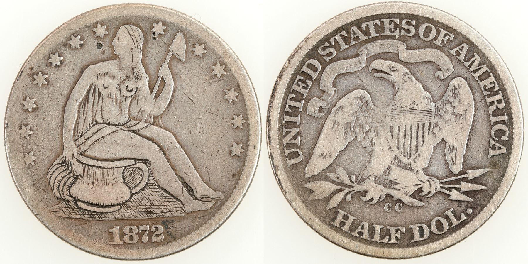 Miss Seated Liberty on a chamber pot on the rare date 1872-CC half dollar. Nice overall condition to the coin: VG-F details. Unique, don't think anyone will be carving into this date coin in the future.