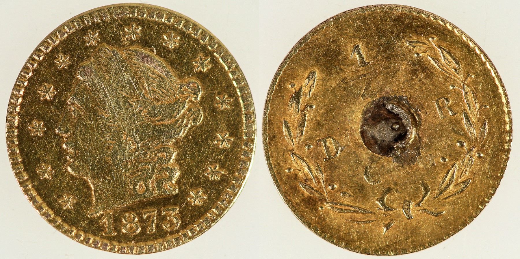 Frontier & Bellemere 1873 1/4 dollar. 10 mm; 0.2 grams. F-EF, solder spot center of reverse. Rarity 4.