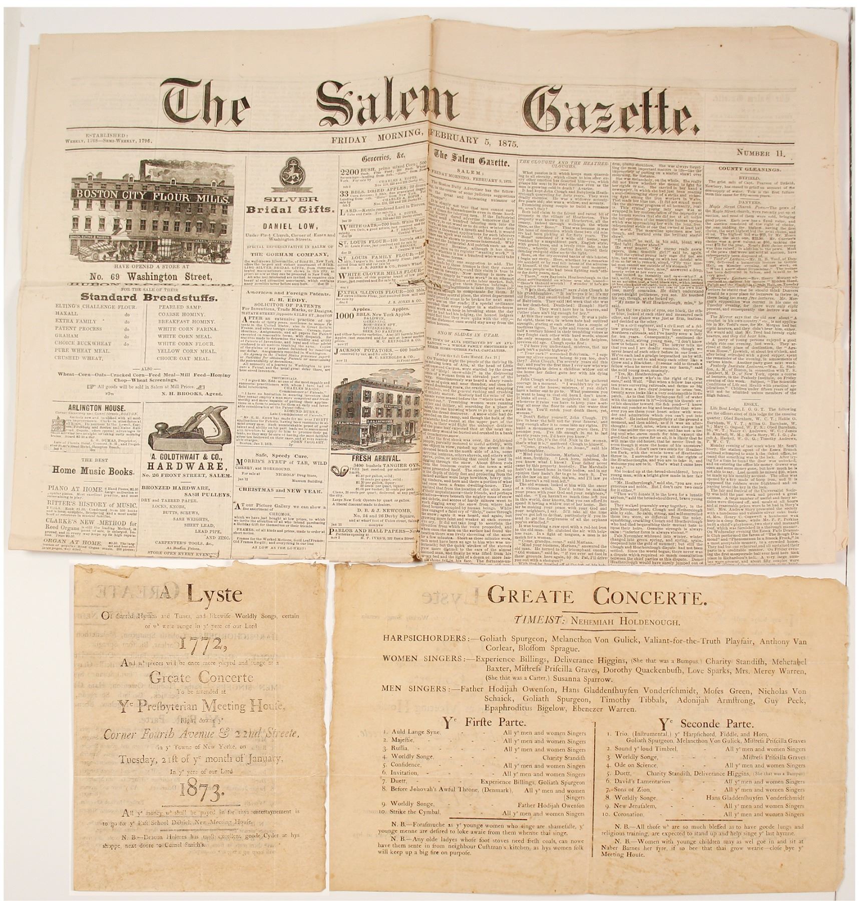 Lot of 2. 1) Program for a concert to be held January 21st, 1873 at the Presbyterian Meeting House in New York where they will sing "Sacred Hymns and Tunes, and likewise Worldly Songs, certain of which were sunge [sic.] in yere [sic/} of our Lord 1772." 3pp Toning, foxing, fading. 2) February 5th, 1875 issue of the The Salem Gazette newspaper. Front page has an article about an avalanche at Alta, Utah. Many advertisements. Folds, some separation and toning.