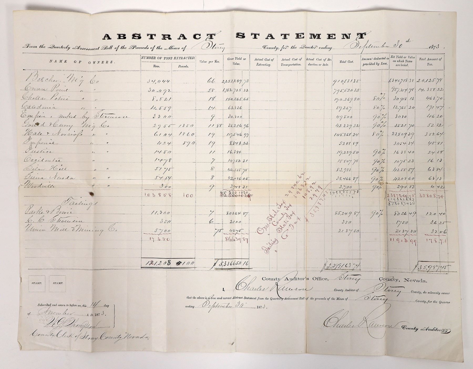Exceptionally rare original source material (used by Couch & Carpenter, 1943) for Comstock ore production the year of the Big Bonanza discovery. Abstract of Statement from the Quarterly Assessment of the Proceeds of the Mines of Storey County for the Quarter ending Sept. 20th, 1873. Lists 13 active mines including Belcher, Crown Point, Chollar Potosi, Empire, Gould & Curry, Hale & Norcross, Sierra Nevada, and more. Includes three tailings operations: Parke & Bowie, CC Stevenson, and the Union Mill & Mining Co. (which was controlled by the Bank of California and William Sharon). Lists Number of tons extracted, value per ton, taxes levied, etc. Signed by county auditor Charles Rawson. For this year, the largest producers are the Belcher at 34,000 tons and Crown Point at 30,000 tons, related to the 1870 Crown Point-Belcher bonanza discovery. Interestingly, the Con. Virginia and California, the site of the March 1873 Big Bonanza discovery, are NOT listed on this form (or in Couch & Carpenter, 1943). This form was issued 6 months after the discovery. Were Mackay and Fair withholding production info about that discovery in an attempt to manipulate stocks? 17 x 22" Folds, some separation.