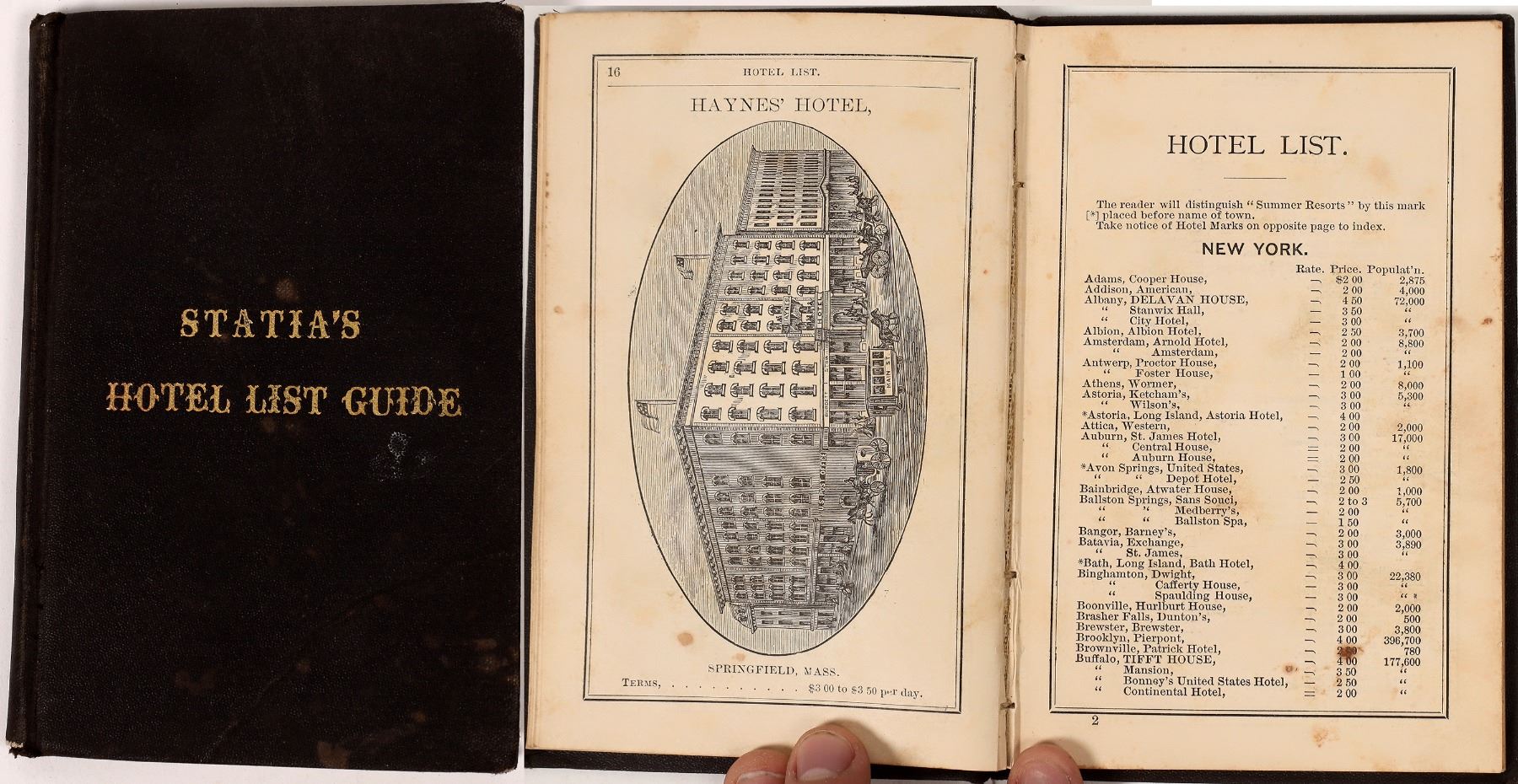 Rare Statia's Hotel List Guide published by W.E. Statia in 1874. Contains a list of hotels across the United States and parts of Canada and Western Europe. There are several nice illustrations of some hotels in the front pages. This list includes information about location and prices for each hotel. Most hotels also have a symbol indicating first class, second class, and summer resorts next to them. Some notable hotels listed in this guide are the Ormsby House in Carson City, the Palace Hotel in San Francisco, and the Inter-Ocean Hotel in Denver. 6 x 4, good condition.