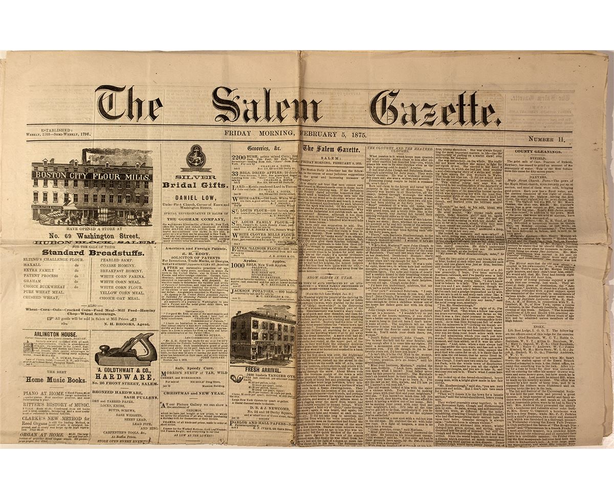 Lot contains the Friday morning edition of the paper which started as a weekly in 1768 and went to a semi-weekly in 1796. One article, picked up from the Salt Lake Herald, chronicles the snow slides in Utah the previous month. The edition is four pages and has several ink blocked illustrations enhancing the articles that range from the aforementioned snow avalanches to the accidental strangulation of a 3-year-old boy. The condition of the publication is fragile, but readable and a great example of a medium that will soon be extinct.