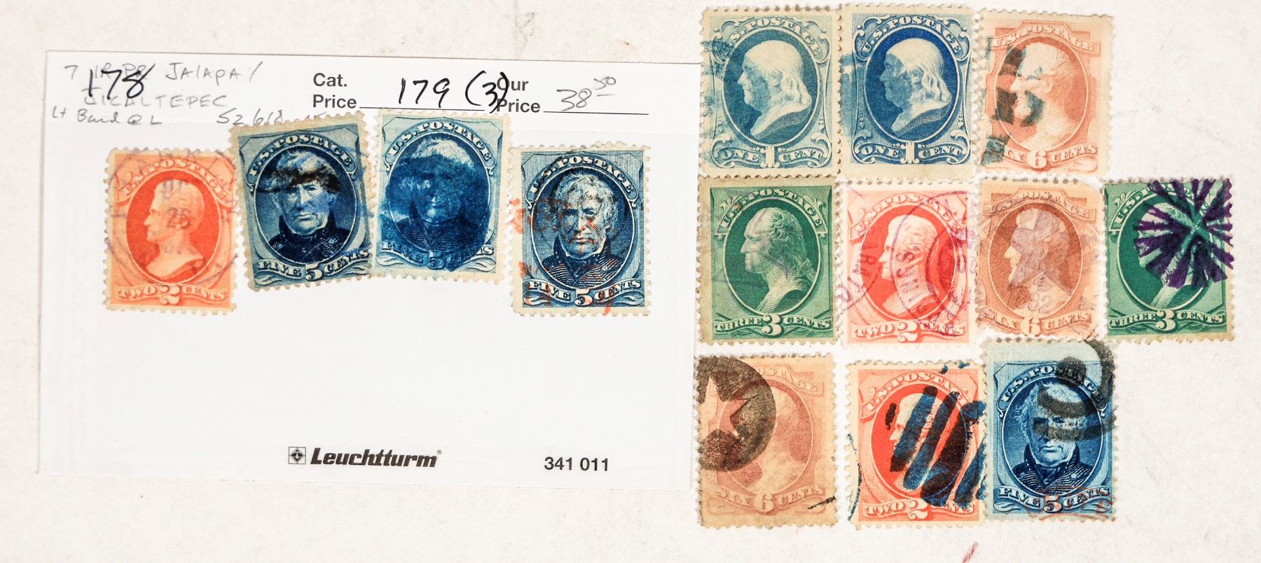 1875 series stamps. Some stamps are duplicates. Includes: 178, 179 (in 3 different cancelation mark colors), 182 (2), 183 (2), 184 (2), 185, 186 (3). See photo.