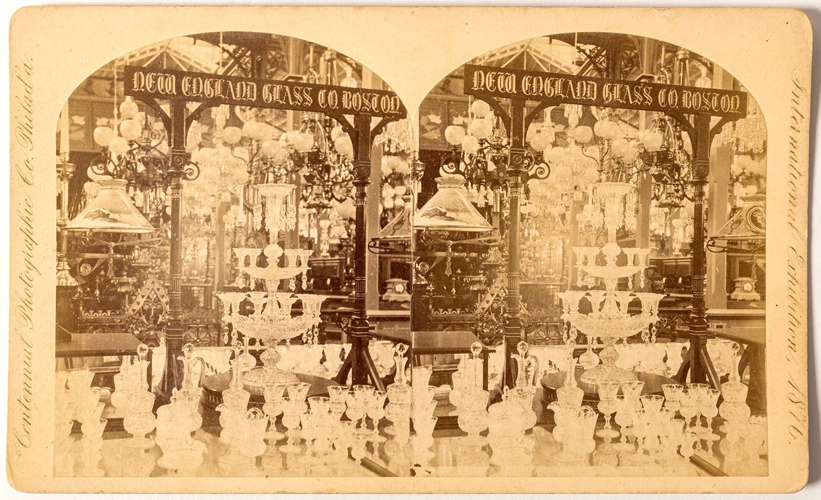 Stereoview showing the elaborate glass display of the New England Glass Company at the exhibition. Medium contrast, some soiling. 4x7" Centennial Photographic Co. The New England Glass Company (1818–1878) was established in 1818 in Cambridge, Massachusetts. As one of the first glass companies to use a steam engine to power its cutting machines, they manufactured both blown and pressed glass objects in a variety of colors with engraved, cut, etched, and gilded decorations. They also built the only oven in the country that could manufacture red lead, a key ingredient in the making of flint glass. It was considered one of the leading glasshouses in the United States, best known for its cut and engraved glass. Date: Location: Philadelphia, Pennsylvania HWAC # 50998
