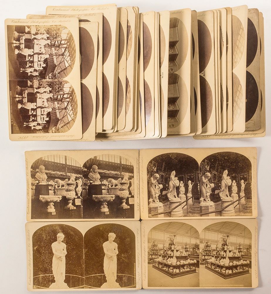 Lot of 40+ large format (4x7") stereoviews by the Centennial Photographic Co. This collection features the paintings, art, and sculptures at the exposition. Views include: 2186-Japanese bronzes, 2546-Elkington & Co.'s Helicon Vase, 1937-The Pet Bird, 1481-The Rose, 1120-First Sensation of Cold Water, 1268-Cupid, 1924-The Forced Prayer, 1121-Flying Time, 1212-Love's Net, 1123-Vanity, 1367-Italian Dep't Memorial Hall Anex, 1174-Pharoahs Daughter, 1267-Storm, 2853-Genius of the Vatican, 2855-Leda and the Swan, 1282-Phryne, 1020-Memorial Hall American Dept, 2060 and 2061-Viti's Alabaster Vases, and many more. Please inspect. Little duplication. Fair to good condition overall. Great set! (Prag Collection) Date: Location: Philadelphia, Pennsylvania HWAC # 50996