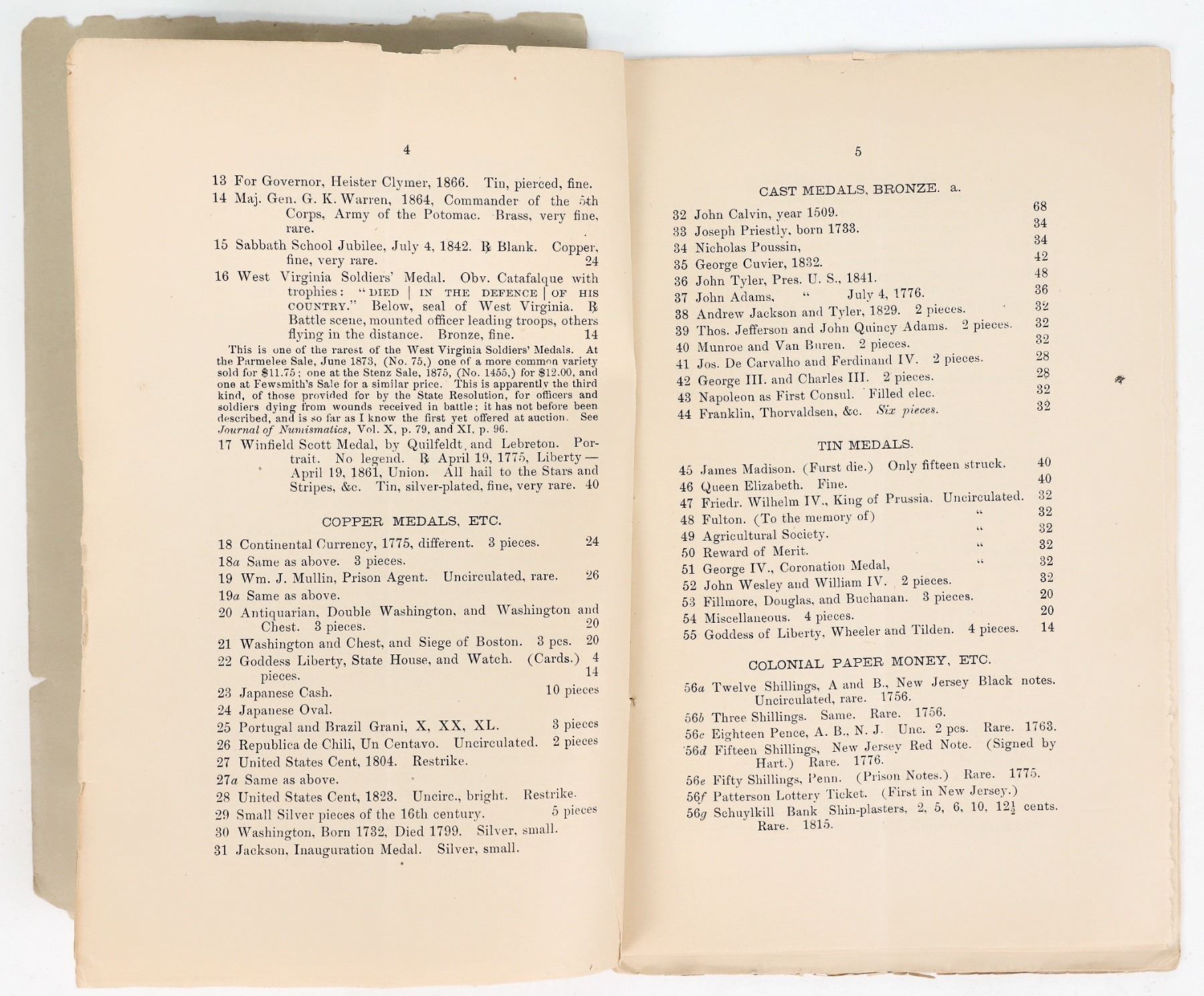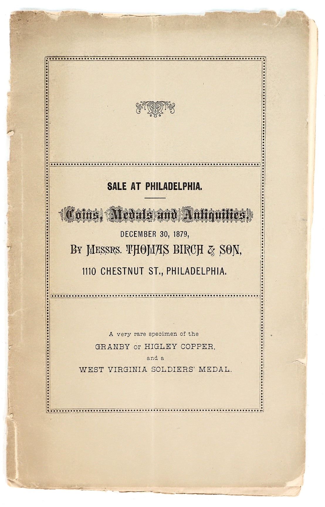 Sale at Philadelphia. Coins, Medals & Antiquities, December 30th, 1879, by Messrs. Thomas Birch & Son, 1110 Chestnut St. Philadelphia. Auction of an "unusually fine and interesting collection of Miscellaneous Antiquities, Stuffed Animals, Birds and Reptiles, Minerals, Fossils, Ancient Chinese Relics, Relics of George and Martha Washington, Coins and Medals, etc." See mention of Comstock and Nevada ore specimens on pgs. 21 and 22. Or 1872 and 1873 proof sets. 23pp. Paper catalog, string binding, cover detached. 9.5 x6 " Fascinating!