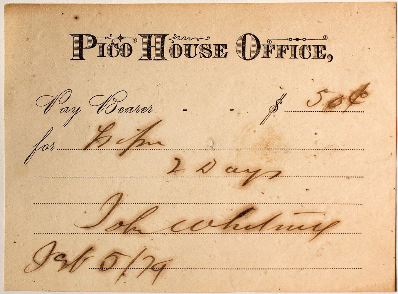 Extra rare! Pico House Office. Pay Bearer 50 cents. Signed by John Whitney. Dated Feb. 5, 1879. 3.5 x 4.5" Toning. Pío Pico, a successful businessman who was the last Mexican Governor of Alta California, ordered construction of a luxury hotel in the growing town of Los Angeles. The architect was Ezra F. Kysor, who also designed the Cathedral of Saint Vibiana, and it was constructed between 1869 and 1870. The resulting Italianate three storey, 33-room hotel, dubbed Pico House (or Casa de Pico) was the most extravagant and lavish hotel in Southern California. (Potter Collection) HWAC# 60193 Date: Location: Los Angeles, California