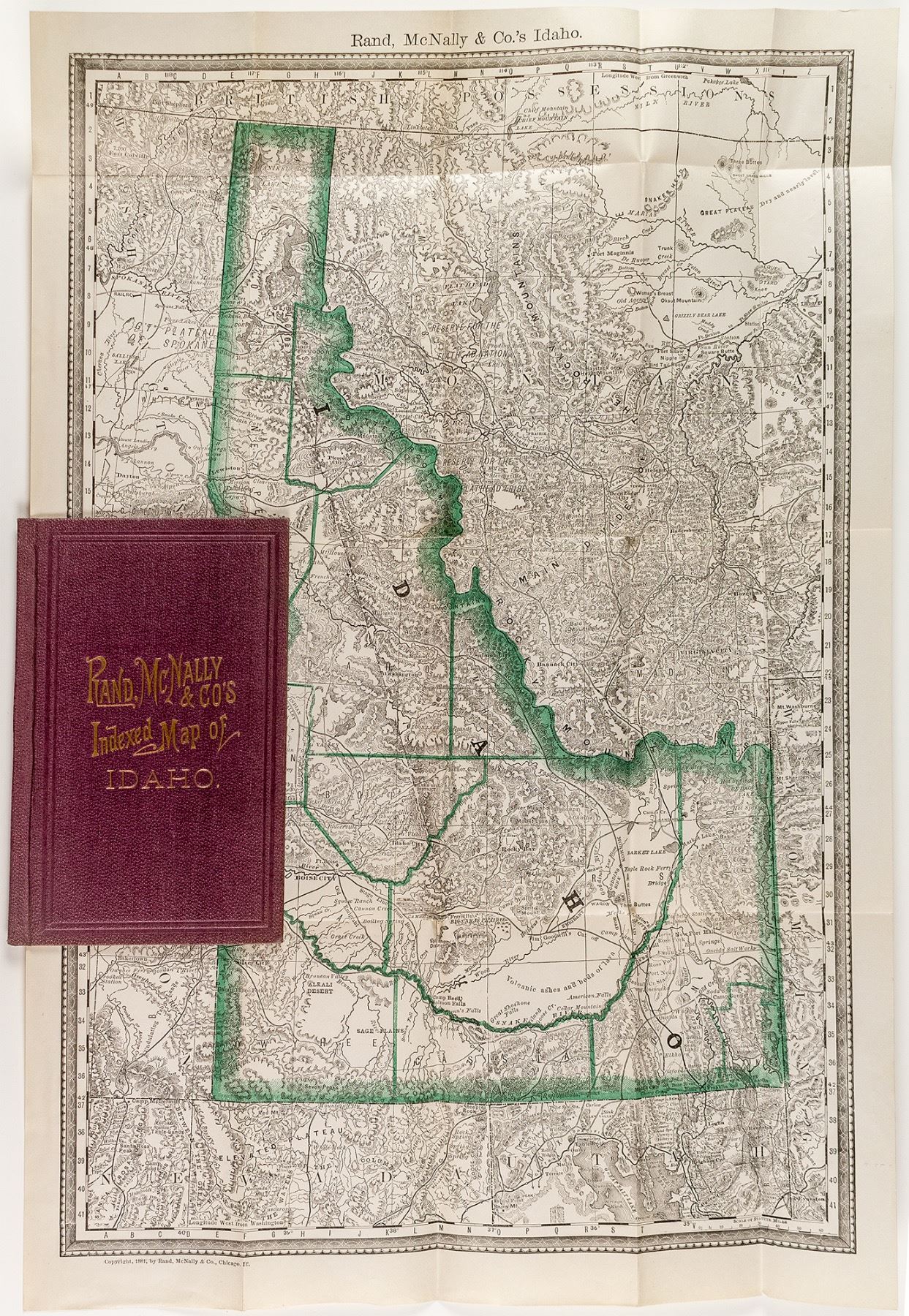 An exquisite pocket map of Idaho by the Rand, McNally and Co's Map Publications Chicago c. 1881. It is indexed and contains a guide with full postal directions, territorial railroads, counties, lakes, and rivers.The fold-able map measures 13" x 21" and fits nicely inside the binding. It is a beautiful piece in mint Condition. State: Idaho City: HWAC#: 38771 Date: