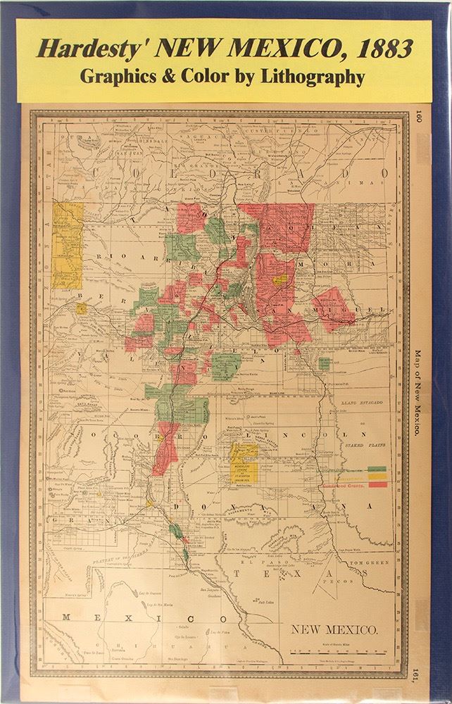 Double Truck, pp. 160,161. Graphics & color by Lithography, shows mining regions of New Mexico. Map shows in green Unconfirmed Grants; in yellow, Reservations (Mescalero, Apache or Ft. Stanton Indian Reservation) & pink are Confirmed Grants. Beautiful condition, vivid color. On Mat Board (not adhered) with plastic covers. If mats are shipped then additional shipping may apply. 14.5" x 20.5". (Potter Collection) Date: 1883 Location: New Mexico HWAC# 59350