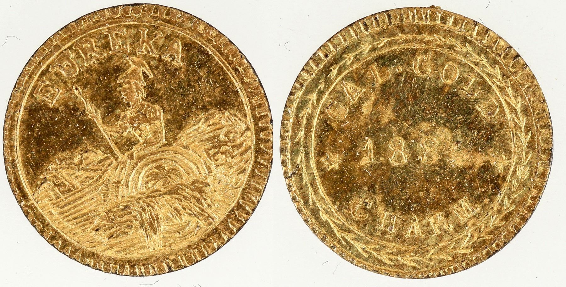 1884 Mohrig token. Period Three issue: Cal Gold / 1884 / Charm // Eureka / Minerva seated. 10 mm; 0.1 gram, AU-BU condition.