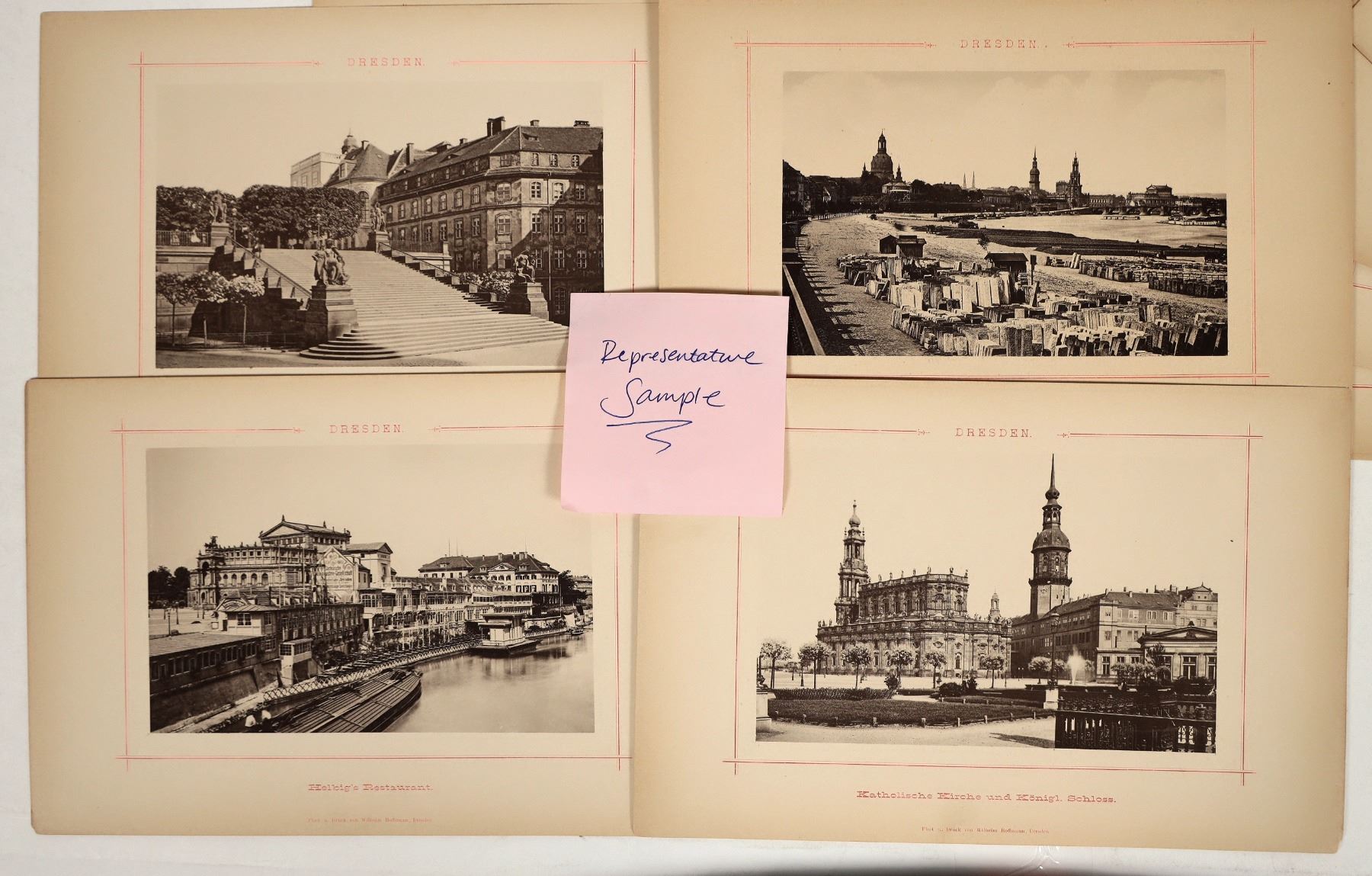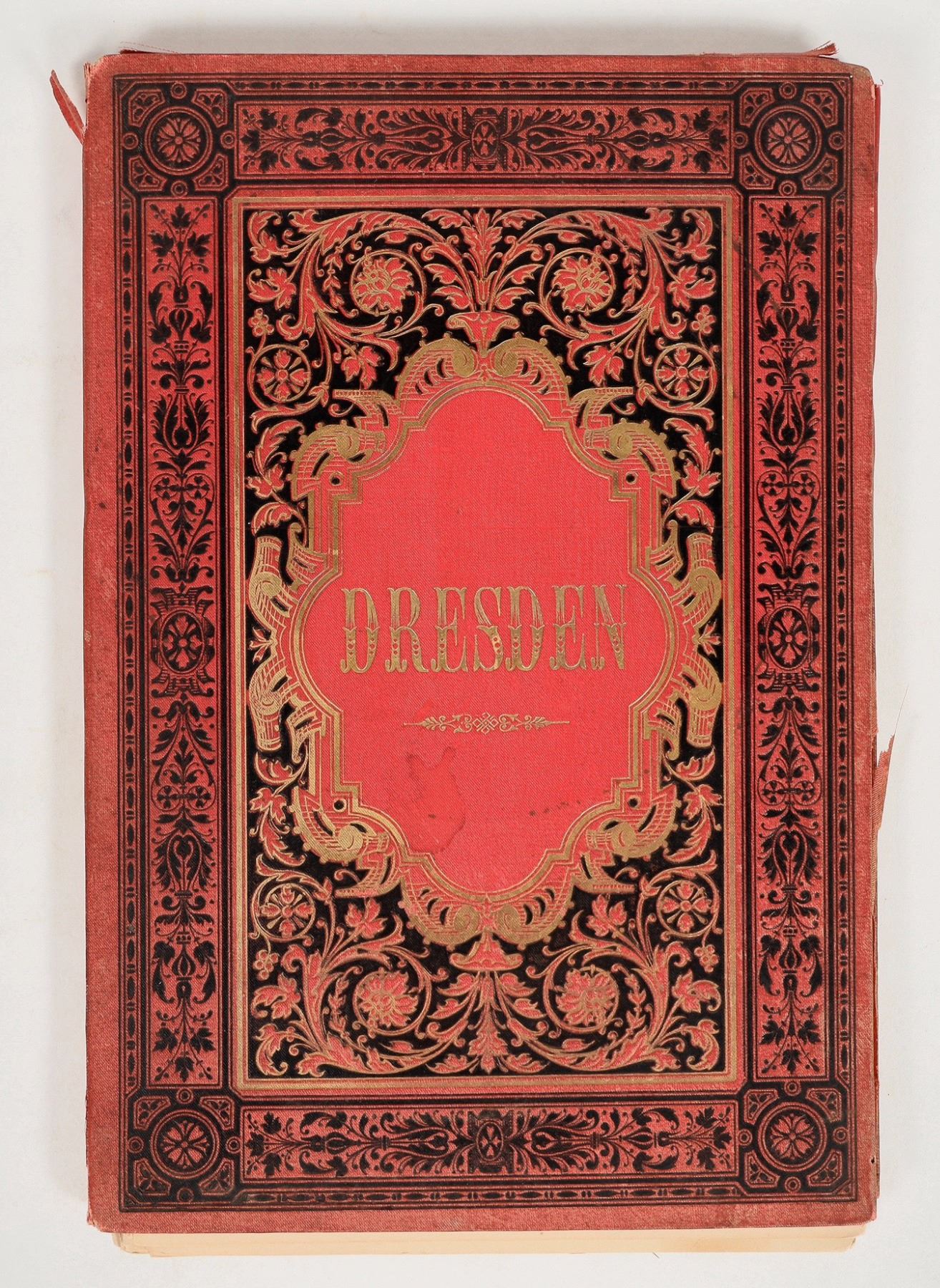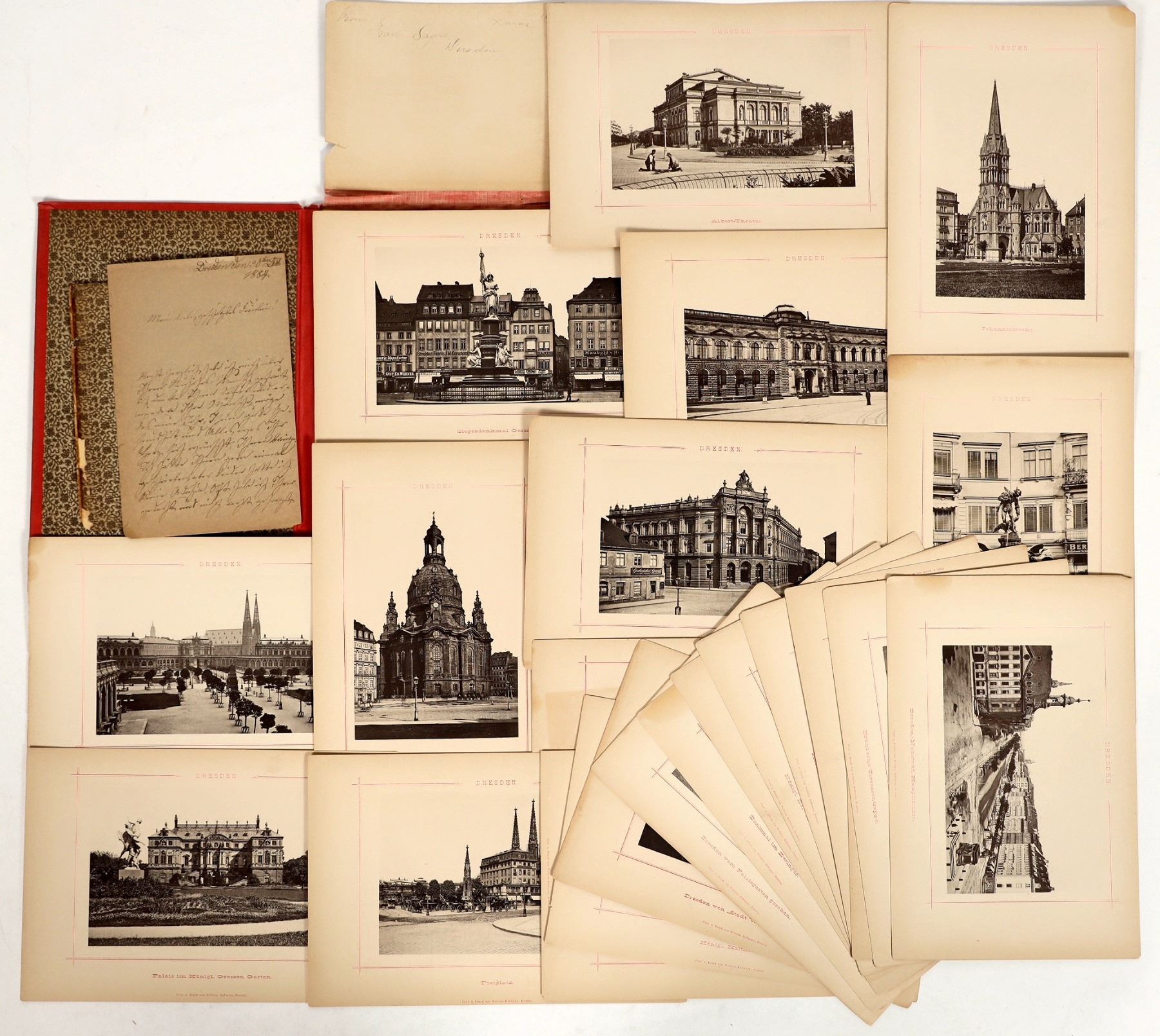 c1884 photos taken by Druck von Wilhelm Hoffmann, in Dresden. This book, titled "Dresden" in gilded letters folds out to reveal it is a holder for approximately 20 photo prints. These photos are of impressive monuments and buildings in Germany. Each print is labeled with a location. Prints are very good quality with minor toning. A minority of the photos have worn edges, with one missing a section about 1mm thick and less than inch long. Pages measure about 9.5x6.25", with photo measuring 4x6.25". The folder sections of the book are in delicate condition, with tears and crumbling sections. See photo.