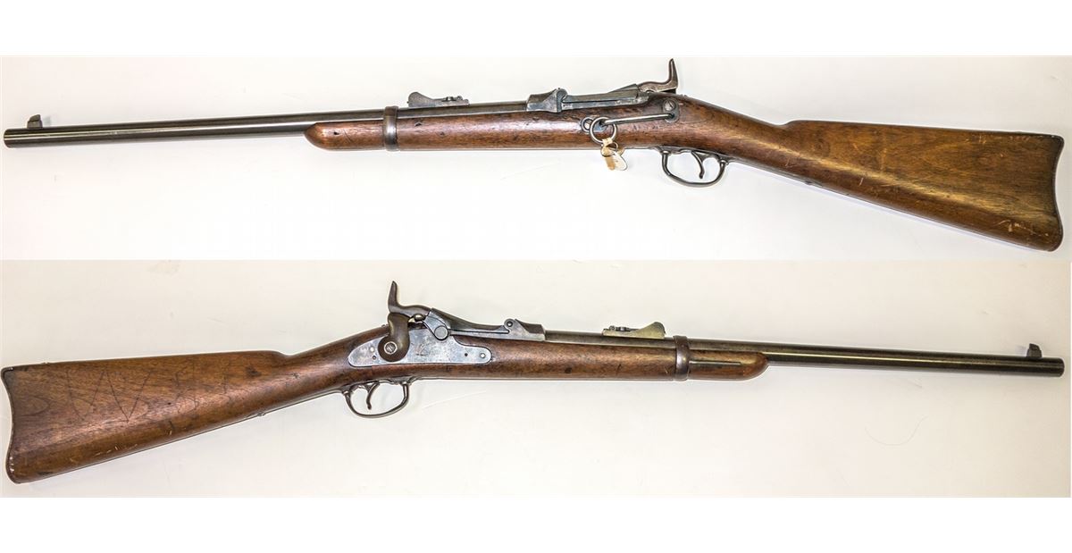 22 inch barrel, similar to the 1879 model. Half stock with single barrel band. Only 20,000 of this version were made between 1886 and 1889. Has right side sling ring and graduated sight to 1200. This rifle is a 45-70 meant to shoot the 500 grain bullet instead of the standard 405 grain. The rifle is in excellent shape with case and blue color hammer and lock with overall bluing on the balance of the gun. Bore is bright and shiny with a few dark spots. The walnut stock and forend are in excellent shape with no major marks. Excellent historic piece of Americana.