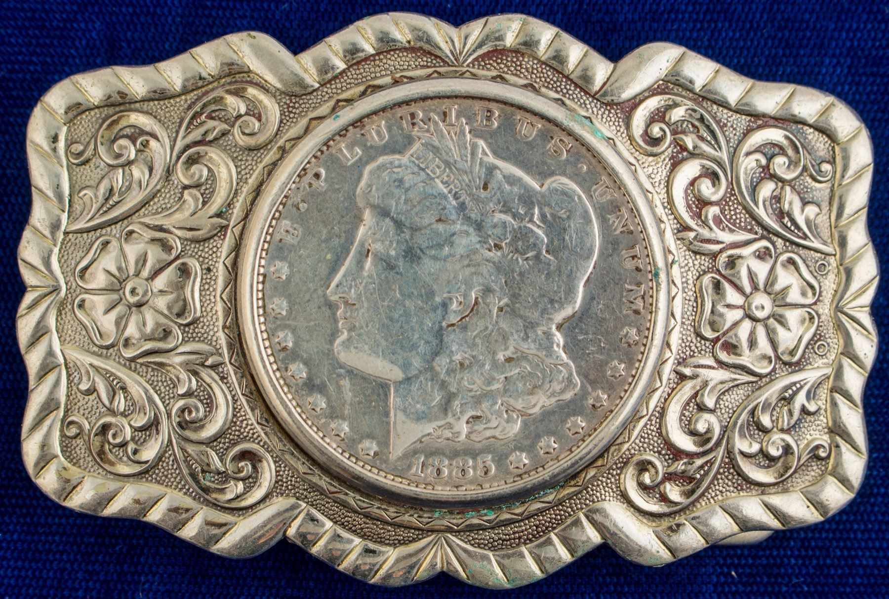 Well worn 1885 Morgan Dollar buckle. Width: 3 1/4 inches; Height: 2 inches. Belt width 1 1/2 inches. State: City: HWAC#: 47367 Date: 1885