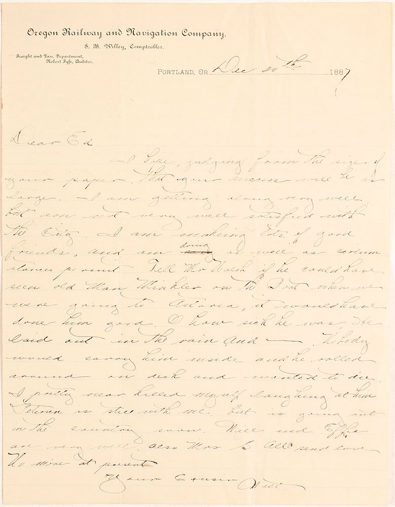On official company letterhead. Written Dec. 30th, 1887 to Ed from Walt. Personal message relates how Walt is doing in Portland ("I am getting along very well but are not very well satisfied with the City."). Also tells of a boating excursion to Astoria where a mutual acquaintance ("Old Man Winkler") got seasick in the rain. 8.25 x 11" Folds. The Oregon Railway & Navigation Co. was incorporated in 1879 in Portland, Oregon and operated between Portland and eastern Washington and Oregon until 1896, when it was reorganized into the Oregon Railroad and Navigation Company. (Potter Collection) HWAC# 60169 Date: Location: Portland, Oregon