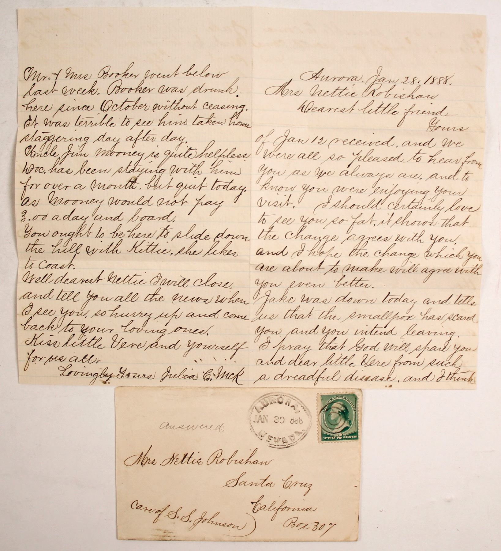 Lot of 2. Letter is 4pp., dateline Aurora, Jan. 28, 1888. Sent to Mrs. Nettie Robishaw of Santa Cruz, California from Julia C. (illegible). Julia has received Nettie's letter. She has heard about the threat of smallpox. Julia looks forward to Nettie coming home, but warns of the cold they would encounter on the journey. She is going to send $50 express to Nettie but will act like she is sending the money to her sister ("we will fool those folks here as long as we can"). "John is still at work in the mine," though he was laid off for a week because of a back issue. She asks Nettie to bring vaccine with her to vaccinate the children. Also mention "helpless" Uncle Jim who the doc has stopped seeing because he won't pay him anymore. Folds. Cover has Aurora postmark and Santa Cruz cancel. Date: City: Aurora State: Nevada HWAC# 77659