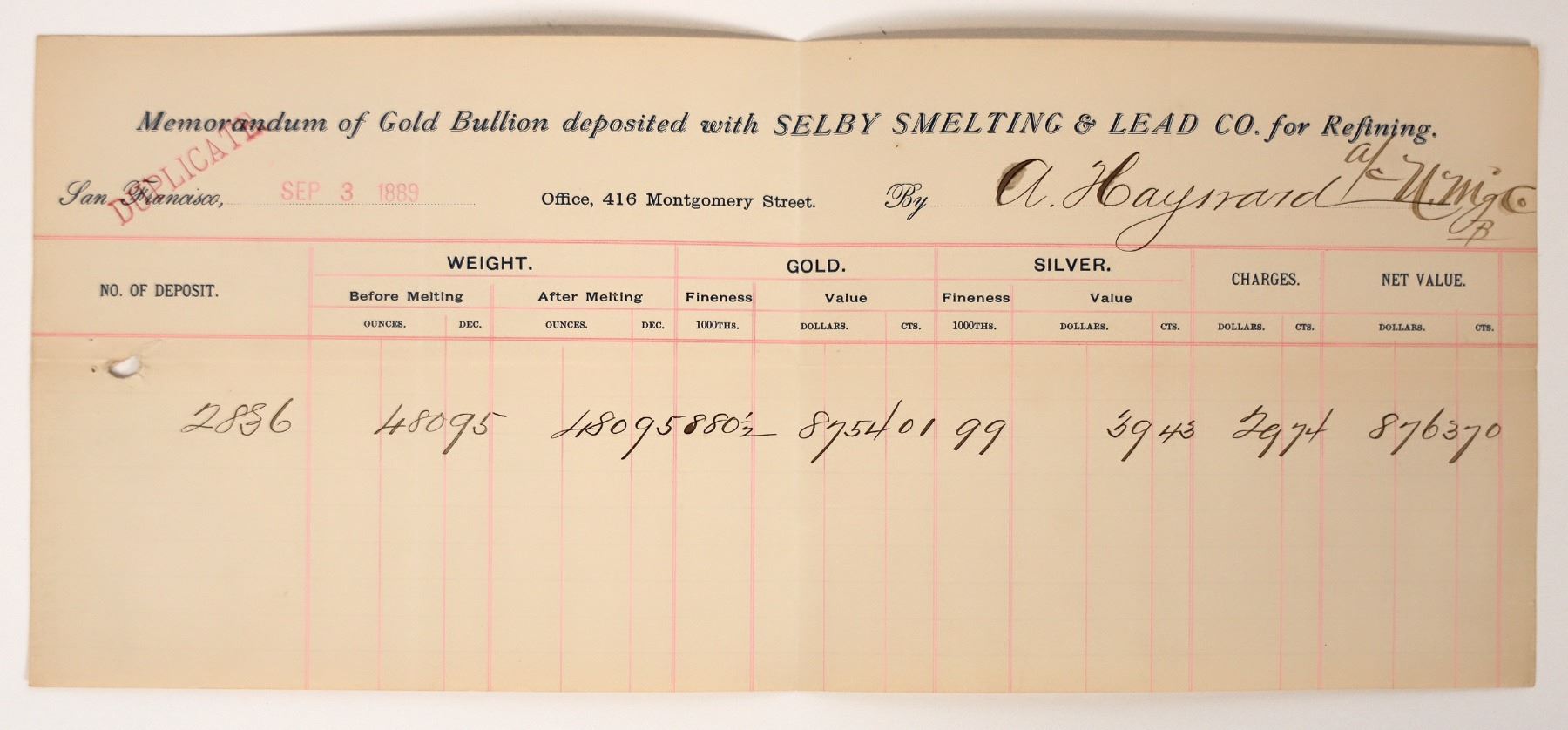 Rare. Selby Smelting & Lead Co. Gold Bullion Assay Memorandum for Alvinza Hayward for the Utica Mining Co. (of Angel's Camp, CA). 480.95 ounces, .880 gold fineness. Valued at $8,763.70. 5 x 12" Alvinza Hayward found his first success in mining in the California Gold Rush, investing in the Eureka Mine in Amador County and then later in the Utica Mine in Angel's Camp. He also invested heavily in the Comstock Lode and had close connections to Sharon and the Bank of California Crowd (once serving as the bank's director). However, he worked with John P Jones in 1872 to take over the Crown Point Mine in Gold Hill which played into the end of Sharon's reign and the beginning of Mackay's.