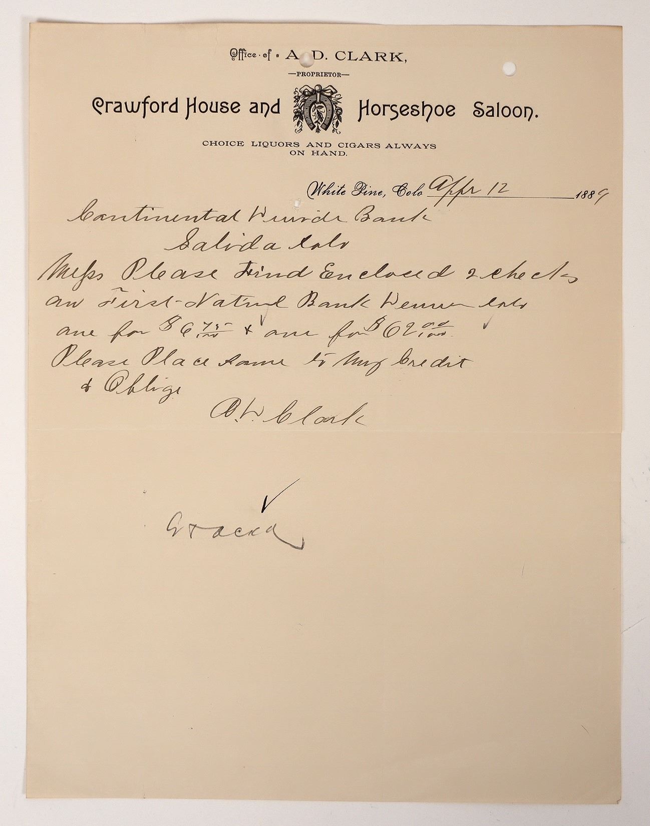 TOKEN KNOWN FOR THIS MERCHANT! Office of AD Clark, proprietor Crawford House and Horseshoe Saloon. Choice Liquors and Cigars Always on Hand. Vignette of a horseshoe. Dateline White Pine, Colo. April 12th, 1889. Message from Clark to the Continental Divide Bank in Salida regarding checks. 10.5 x 8" Folds, punch holes, small tears. The Horseshoe Saloon was twenty-five by fifty feet and contained a pool table and five round tables for gambling and was one of the centers of attraction in the camp in 1883. White Pine is now a ghost town in Gunnison County. It was a silver mining camp that started in 1878. By 1883, there were a 1,000 miners in the camp. The town was largely abandoned after the Silver Panic of 1893. The area also had problems with avalanches.