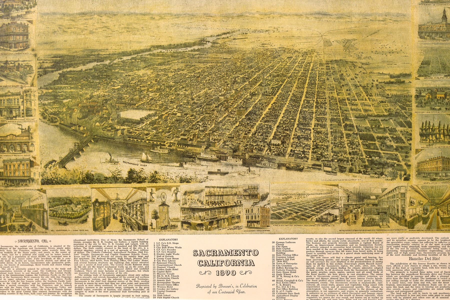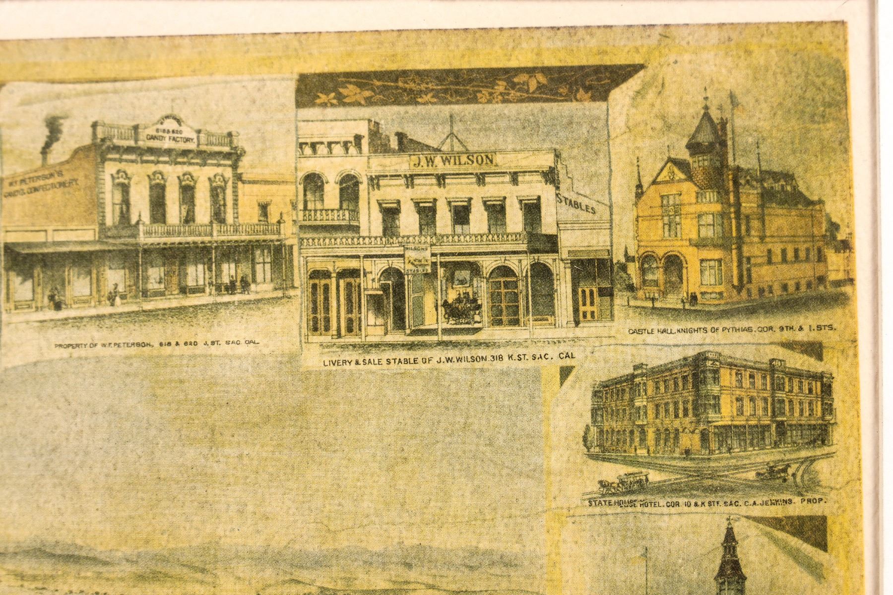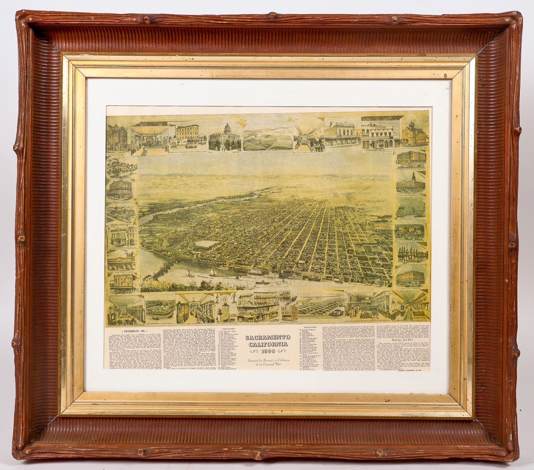 An illustration of Sacramento, California as it existed in 1890, reprinted in 1990 for the city's centennial. The illustration, which shows an aerial view of the city, also includes a number of labelled vignettes of notable buildings and landmarks. The bottom margin of the print includes a text description/history of the city. Presented in an exceptional frame measuring approx. 28"x25". Great piece for any enthusiast or collector of California history.