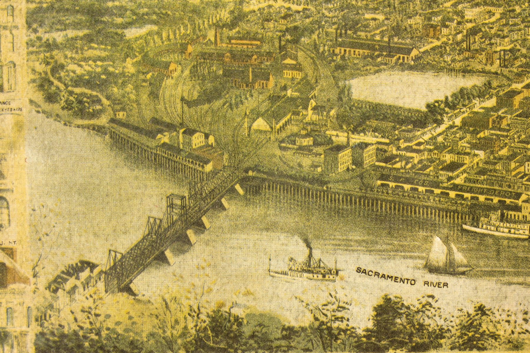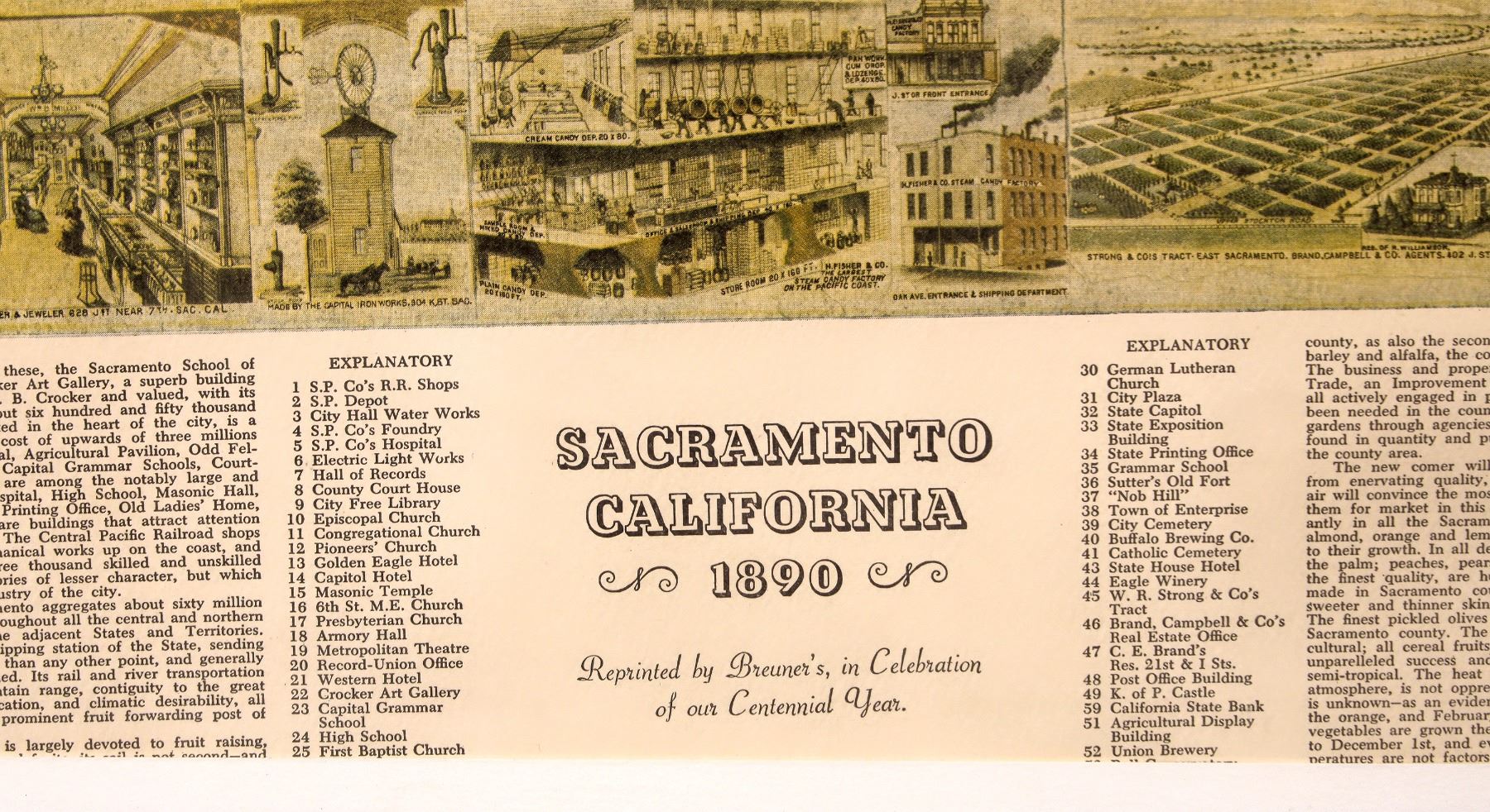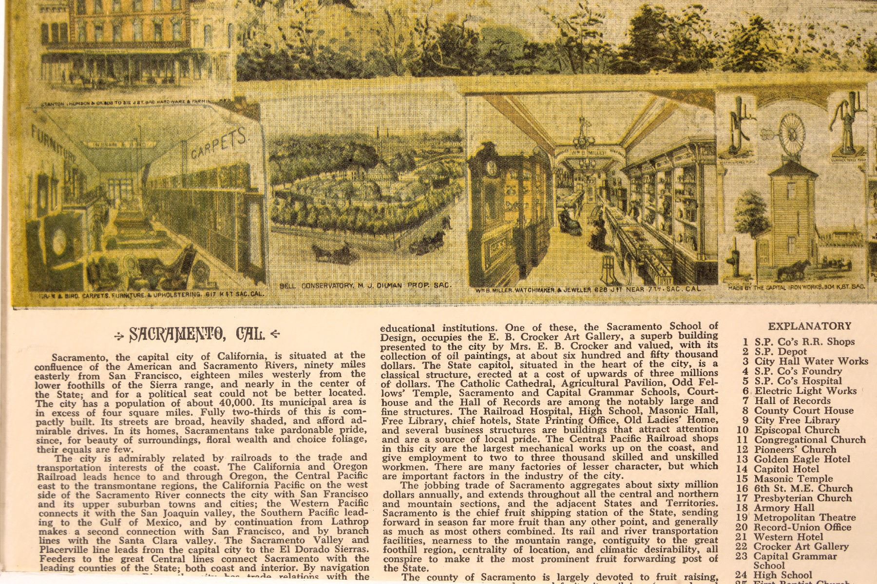 An illustration of Sacramento, California as it existed in 1890, reprinted in 1990 for the city's centennial. The illustration, which shows an aerial view of the city, also includes a number of labelled vignettes of notable buildings and landmarks. The bottom margin of the print includes a text description/history of the city. Presented in an exceptional frame measuring approx. 28"x25". Great piece for any enthusiast or collector of California history.