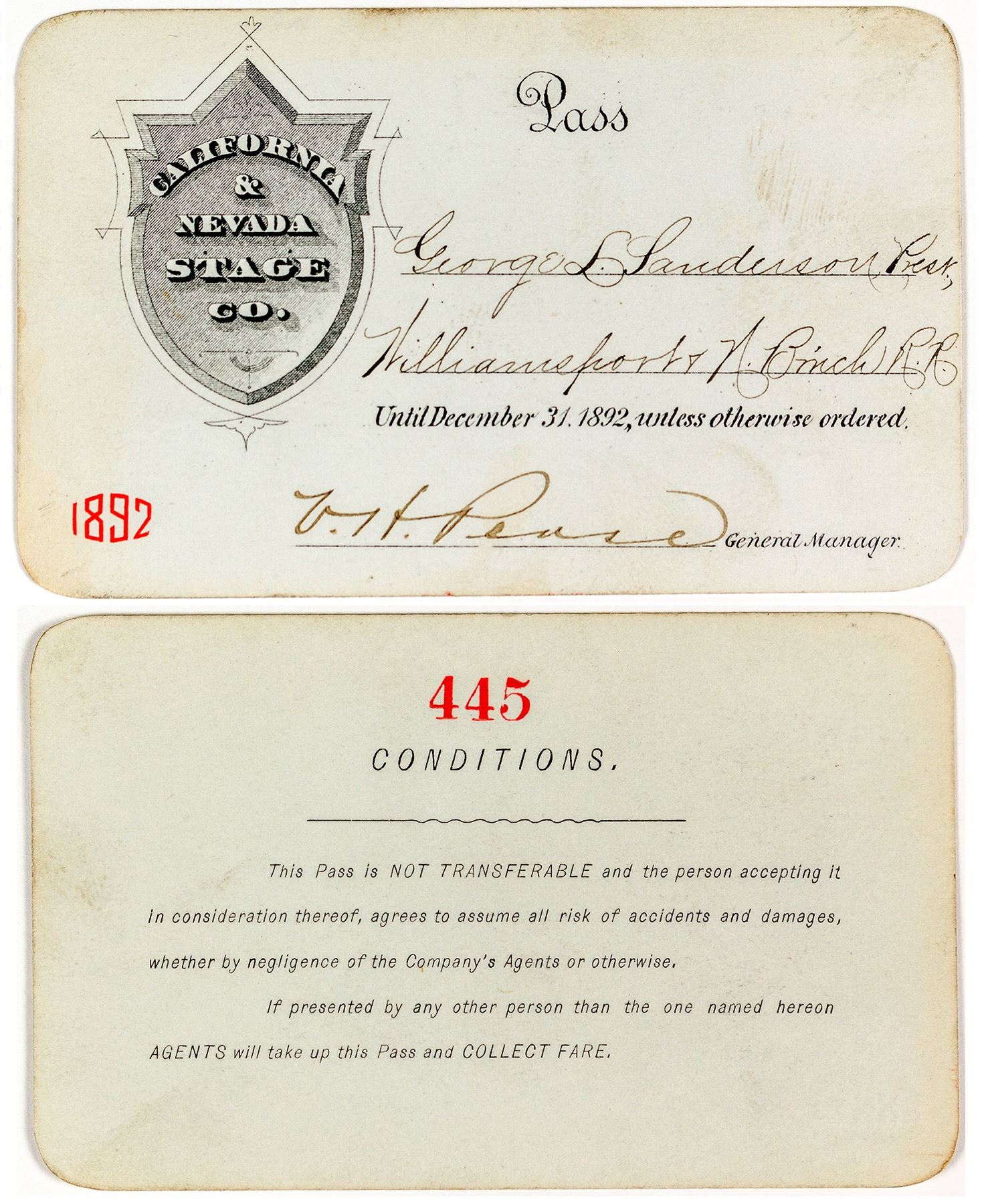 No. 445, issued for 1892 to George Sanderson, president of the Williamsport & North Branch Railroad. Signed by V.H. Pease as general manager. Ornate logo. Printed on cardstock. Minor wear. Information on this stage was very hard to find. However, V.H. Pease was also the general manager of the Nevada Stage Company which operated in California and offered trips to Yosemite in the 1880s via Sonora, Columbia, Milton and Chinese Camp. It is likely that the California & Nevada Stage Company is the later incarnation. We find V. H. Pease applying for and winning mail routes all over the West from 1882 to 1886. These include: Reno to Susanville, Eureka to Diamond (Agent), Bullionville to St. Thomas (Agent), Austin to Grantville (Agent), Sodaville to Belmont, Pioche to Taylor via Royal City, Tybo to Tem Piute via Reveille, etc. Additional routes and history are included. (Prag Collection) State: Nevada City: Carson City, Ormsby Date: HWAC# 99439