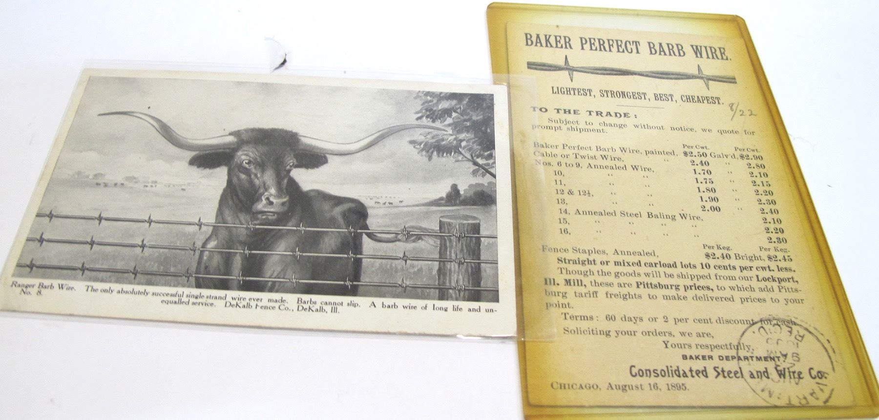 Sold by Consolidated Steel and Wire Company. Includes price list. 2) Ranger Barb Wire. The only absolutely single strand wire ever made. Photo of steer looking sad! Made in Dekalb, Illinois. Sold by I. T. Bryant of Oxford, Ohio. Date: Location: Chicago, Illinois HWAC # 53957